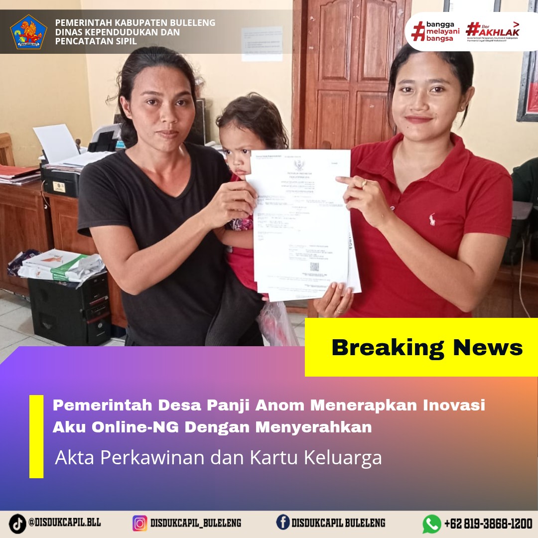 Pemerintah Kabupaten Buleleng melalui Dinas Kependudukan dan Pecatatan Sipil (Disdukcapil) Kabupaten Buleleng memaksimalkan serta mempermudah pelayanan kependudukan masyarakat dengan beberapa inovasi, melalui aplikasi AKU Online-NG. Dimana dalam penerapan aplikasi Aku Online-NG tersebut masyarakat tidak perlu lagi datang ke Dinas Dukcapil untuk melakukan pelayanan langsung cukup dengan datang ke Desa nanti akan dibantu oleh operator Desa masing-masing. Di Desa Panji Anom Kecamatan Sukasada, telah diserahkan dokumen kependudukan berupa Akta Perkawinan dan Kartu Keluarga atas nama Kadek Ariawan yang diserahkan secara langsung oleh Operator Desa Panji Anom, Jumat (17/10).