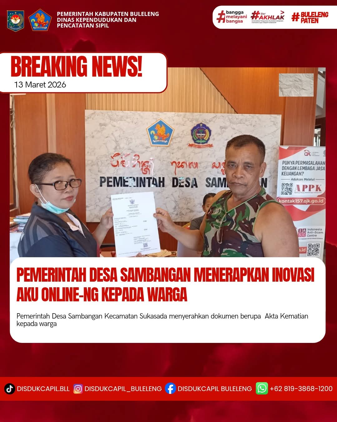 Pemerintah Kabupaten Buleleng melalui Dinas Kependudukan dan Pecatatan Sipil (Disdukcapil) Kabupaten Buleleng memaksimalkan serta mempermudah pelayanan kependudukan masyarakat dengan beberapa inovasi, melalui aplikasi AKU Online-NG. Dimana dalam penerapan aplikasi Aku Online-NG tersebut masyarakat tidak perlu lagi datang ke Dinas Dukcapil untuk melakukan pelayanan langsung cukup dengan datang ke Desa nanti akan dibantu oleh operator Desa masing-masing. Di Desa Sambangan Kecamatan Sukasada, telah diserahkan dokumen kependudukan berupa Akta Kematian atas nama Gede Sumandra dan warga BD. Sambangan diserahkan oleh Kasi Pemerintahan Desa Sambangan bertempat di Kantor Perbekel Desa Sambangan, Kecamatan Sukasada, Kabupaten Buleleng, Jumat (13/3).
