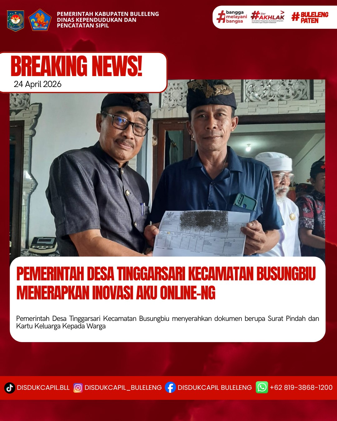 Pemerintah Kabupaten Buleleng melalui Dinas Kependudukan dan Pecatatan Sipil (Disdukcapil) Kabupaten Buleleng memaksimalkan serta mempermudah pelayanan kependudukan masyarakat dengan beberapa inovasi, melalui aplikasi AKU Online. Dimana dalam penerapan aplikasi Aku Online tersebut masyarakat tidak perlu lagi datang ke Dinas Dukcapil untuk melakukan pelayanan langsung, cukup dengan datang ke Desa nanti akan dibantu oleh operator Desa masing-masing. Di Desa Tinggarsari Kecamatan Busungbiu telah diserahkan dokumen kependudukan berupa Kartu Keluarga an. Wayan Sepiawan dan pindah domisili anaknya Kadek Ani yang kawin ke Banjar Kelod Desa Antiga Karangasem yang diserahkan oleh Perbekel Desa Tinggarsari Kecamatan Busungbiu Ketut Samiasa, Jumat (24/4).
