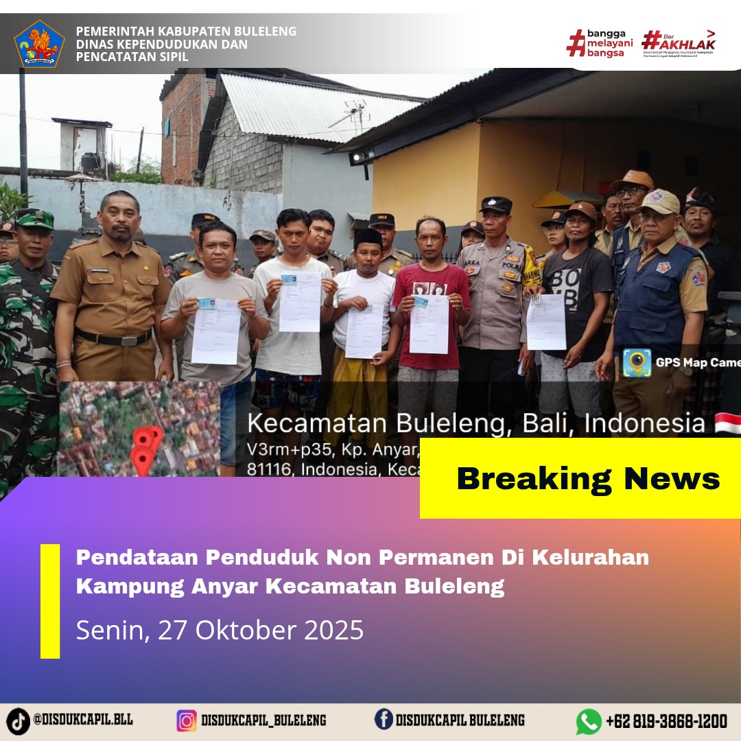 Kali ini Senin, 27 Oktober 2025, Dinas Kependudukan dan Pencatatan Sipil Kabupaten Buleleng melaksanakan kegiatan pendataan penduduk Non Permanen di Kelurahan Kampung Anyar Kecamatan Buleleng. Dari pendataan penduduk kali ini didapatkan hasil :