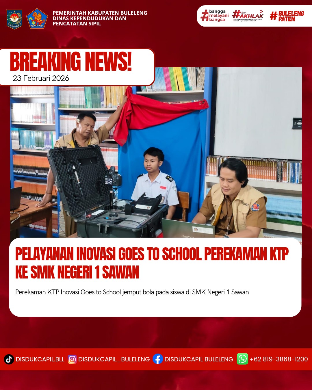 Pada kali ini Senin, 23 Februari 2026 pelayanan perekaman KTP-el dilaksanakan di SMK Negeri 1 Sawan. Hasil perekaman di SMK Negeri 1 Sawan dengan data BNBA sebanyak 337 orang dan total yang melakukan perekaman sebanyak 87 orang, dimana hasil perekaman data di dalam BNBA sebanyak 84 orang dan data di luar BNBA sebanyak 3 orang yang melakukan perekaman. Dilihat dari hasil tersebut sisa data BNBA yang belum perekaman sebanyak 253 orang keterangan dari pihak sekolah bahwa sisa dari BNBA dilanjutkan hari berikutnya.