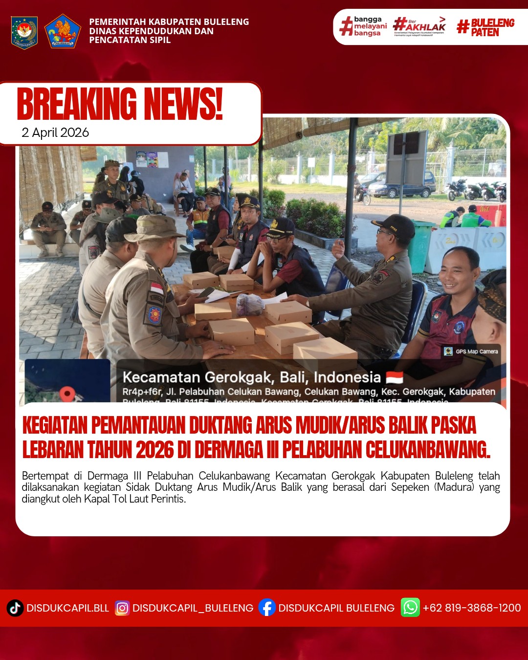 Pada hari Kamis, tanggal 2 April 2026 pukul 06.30 Wita bertempat di Dermaga III Pelabuhan Celukanbawang Kecamatan Gerokgak Kabupaten Buleleng telah dilaksanakan kegiatan Sidak Duktang Arus Mudik/Arus Balik yang berasal dari Sepeken (Madura) yang diangkut oleh Kapal Tol Laut Perintis.