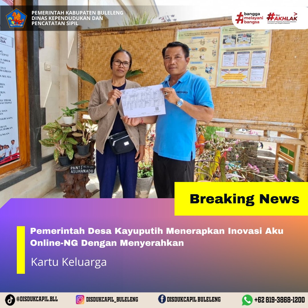 Pemerintah Kabupaten Buleleng melalui Dinas Kependudukan dan Pecatatan Sipil (Disdukcapil) Kabupaten Buleleng memaksimalkan serta mempermudah pelayanan kependudukan masyarakat dengan beberapa inovasi, melalui aplikasi AKU Online-NG. Dimana dalam penerapan aplikasi Aku Online-NG tersebut masyarakat tidak perlu lagi datang ke Dinas Dukcapil untuk melakukan pelayanan langsung cukup dengan datang ke Desa nanti akan dibantu oleh operator Desa masing-masing. Di Desa Kayuputih Kecamatan Sukasada, telah diserahkan dokumen kependudukan berupa Kartu Keluarga atas nama Ketut Marayasa yang beralamat di Banjar Dinas Panti yang diserahkan secara langsung oleh Kasi Pemerintahan Desa Kayuputih Kecamatan Sukasada, Jumat (12/12).