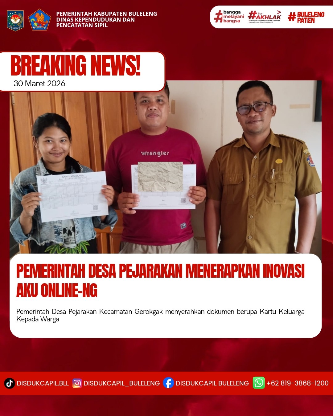 Pemerintah Kabupaten Buleleng melalui Dinas Kependudukan dan Pecatatan Sipil (Disdukcapil) Kabupaten Buleleng memaksimalkan serta mempermudah pelayanan kependudukan masyarakat dengan beberapa inovasi, melalui aplikasi AKU Online-NG. Dimana dalam penerapan aplikasi Aku Online-NG tersebut masyarakat tidak perlu lagi datang ke Dinas Dukcapil untuk melakukan pelayanan langsung, cukup dengan datang ke Desa nanti akan dibantu oleh operator Desa masing-masing. Di Desa Pejarakan Kecamatan Gerokgak, telah diserahkan dokumen kependudukan berupa Kartu Keluarga atas nama Komang Dewi Septiani dan Komang Suadnyana yang diserahkan langsung oleh Pemerintahan Desa Pejarakan bertempat di Kantor Perbekel Desa Pejarakan, Kecamatan Gerokgak, Kabupaten Buleleng, Senin (30/3).