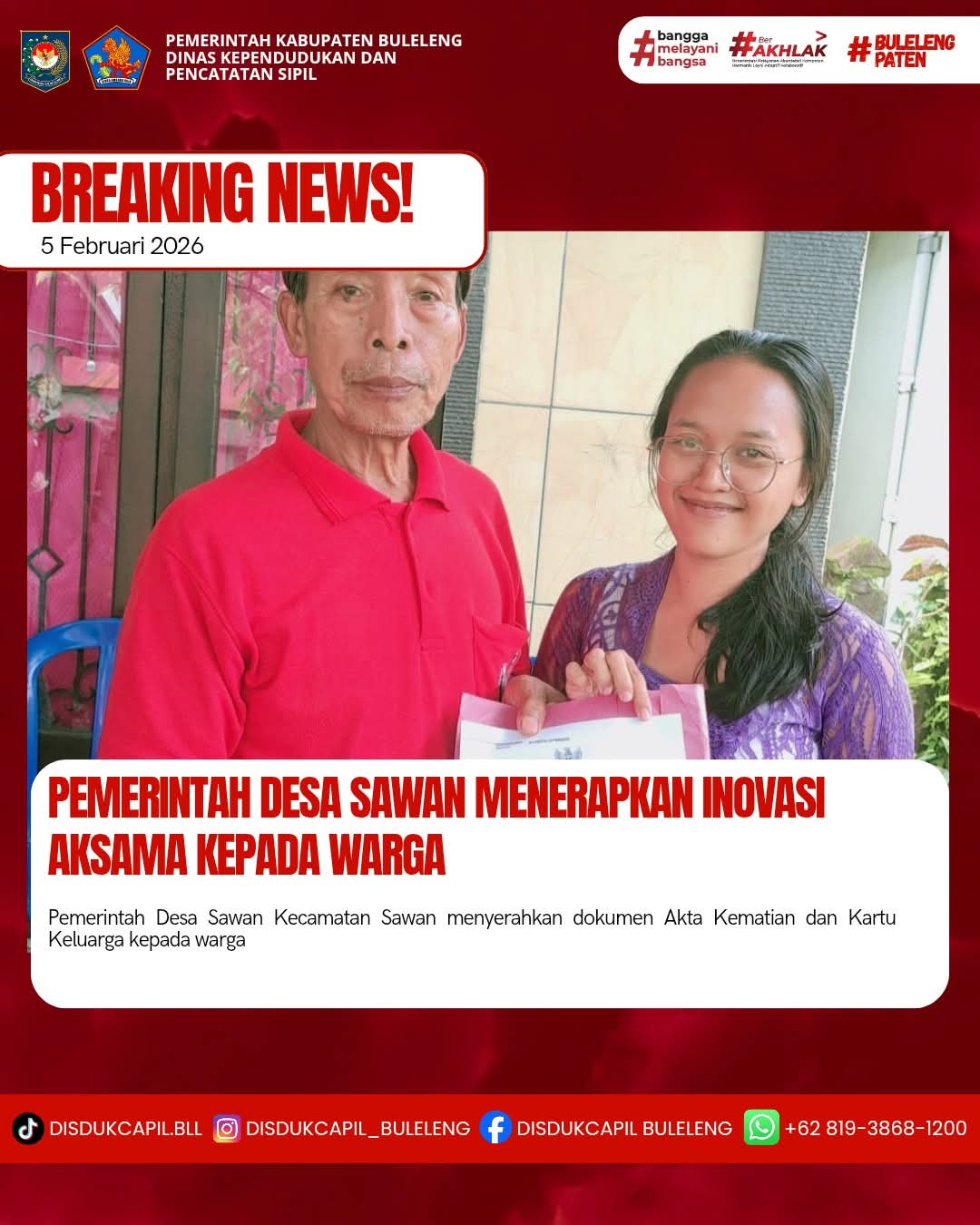 Pemerintah Kabupaten Buleleng melalui Dinas Kependudukan dan Pecatatan Sipil (Disdukcapil) Kabupaten Buleleng memaksimalkan serta mempermudah pelayanan kependudukan masyarakat dengan beberapa inovasi, yakni BALITA (Bayi Lahir Berakta), NYAKSI (Menyerahkan Akta Kawin Saat Acara Perkawinan) dan AKSAMA ( Akta Kematian Diserahkan Saat Masih Berduka) melalui aplikasi Aku Online. Di Desa Sawan Kecamatan Sawan, telah diterapkan program Aksama (Akta Kematian Diserahkan Saat Masih Berduka) yang dilakukan secara langsung oleh Kasi Pemerintahan Desa Sawan menyerahkan Akta Kematian atas nama Made Suarmi dan Kartu Keluarga di Desa Sawan, Kecamatan Sawan, Kamis (5/2).