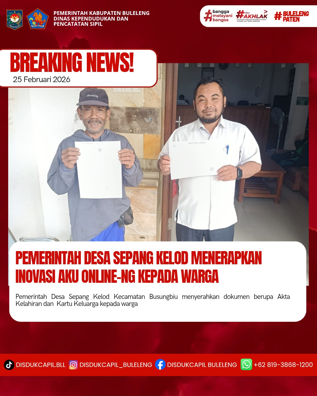 Pemerintah Kabupaten Buleleng melalui Dinas Kependudukan dan Pecatatan Sipil (Disdukcapil) Kabupaten Buleleng memaksimalkan serta mempermudah pelayanan kependudukan masyarakat dengan beberapa inovasi, melalui aplikasi AKU Online. Dimana dalam penerapan aplikasi Aku Online tersebut masyarakat tidak perlu lagi datang ke Dinas Dukcapil untuk melakukan pelayanan langsung cukup dengan datang ke Desa nanti akan dibantu oleh operator Desa masing-masing. Di Desa Sepang Kelod Kecamatan Busungbiu telah diserahkan dokumen kependudukan berupa Akta Kelahiran dan Kartu Keluarga atas nama Kadek Durnawan warga Banjar Dinas Asah Badung Desa Sepang Kelod yang diserahkan oleh Kasi Pemerintahan Desa Sepang Kelod, bertempat di Kantor Perbekel Desa Sepang Kelod, Kecamatan Busungbiu, Rabu (25/2).