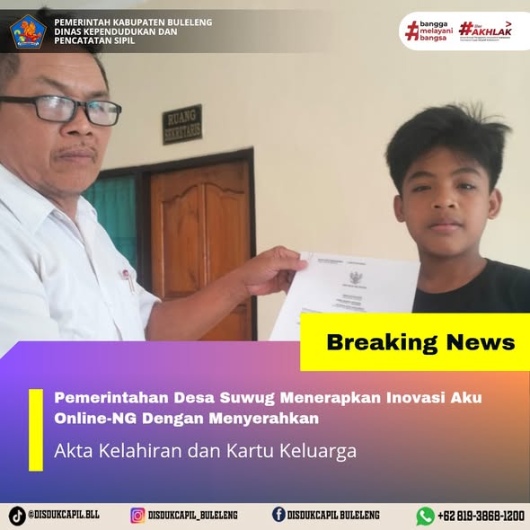 Pemerintah Kabupaten Buleleng melalui Dinas Kependudukan dan Pecatatan Sipil (Disdukcapil) Kabupaten Buleleng memaksimalkan serta mempermudah pelayanan kependudukan masyarakat dengan beberapa inovasi, melalui aplikasi AKU Online-NG. Dimana dalam penerapan aplikasi Aku Online-NG tersebut masyarakat tidak perlu lagi datang ke Dinas Dukcapil untuk melakukan pelayanan langsung cukup dengan datang ke Desa nanti akan dibantu oleh operator Desa masing-masing. Di Desa Suwug Kecamatan Sawan, Pemerintahan Desa telah menyerahkan dokumen kependudukan berupa Akta Kelahiran dan Kartu Keluarga, Rabu (26/11).