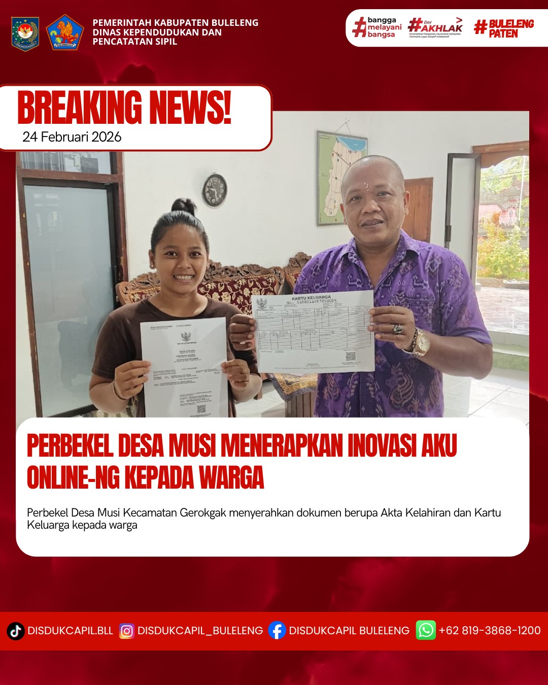 Pemerintah Kabupaten Buleleng melalui Dinas Kependudukan dan Pecatatan Sipil (Disdukcapil) Kabupaten Buleleng memaksimalkan serta mempermudah pelayanan kependudukan masyarakat dengan beberapa inovasi, melalui aplikasi AKU Online-NG. Dimana dalam penerapan aplikasi Aku Online-NG tersebut masyarakat tidak perlu lagi datang ke Dinas Dukcapil untuk melakukan pelayanan langsung cukup dengan datang ke Desa nanti akan dibantu oleh operator Desa masing-masing. Di Desa Musi Kecamatan Gerokgak, telah diserahkan dokumen kependudukan berupa Akta Kelahiran dan Kartu Keluarga yang diserahkan langsung oleh Perbekel Desa Musi NYOMAN ARYA SWABAWA di Desa Musi Kecamatan Gerokgak, Kabupaten Buleleng, Selasa (24/2).