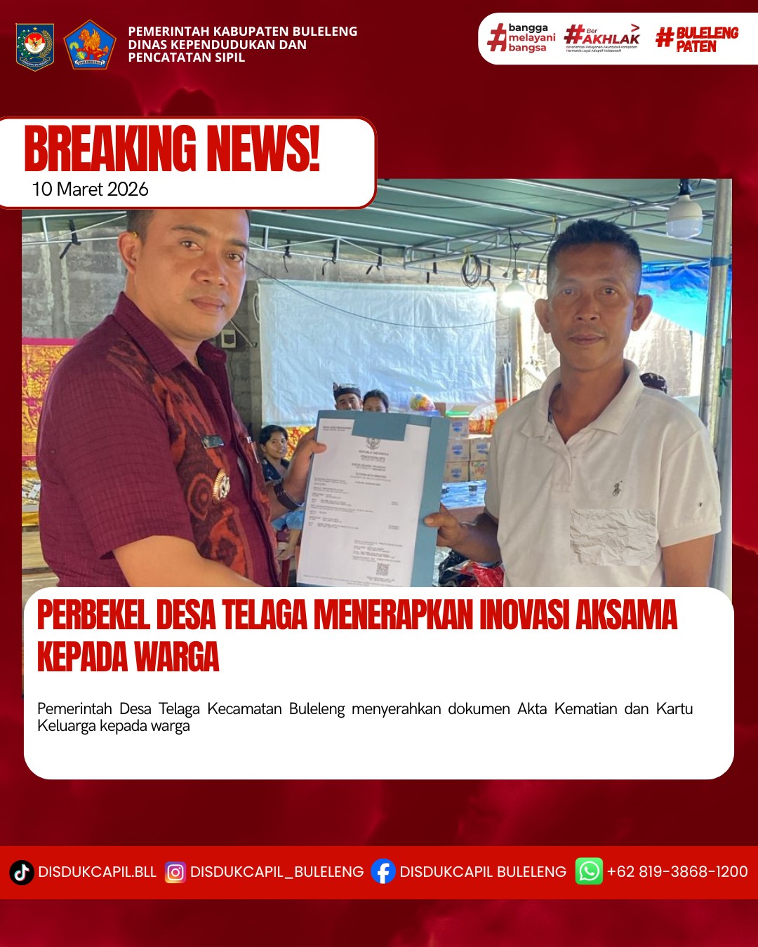 Pemerintah Kabupaten Buleleng melalui Dinas Kependudukan dan Pecatatan Sipil (Disdukcapil) Kabupaten Buleleng memaksimalkan serta mempermudah pelayanan kependudukan masyarakat dengan beberapa inovasi, yakni BALITA (Bayi Lahir Berakta), NYAKSI (Menyerahkan Akta Kawin Saat Acara Perkawinan) dan AKSAMA ( Akta Kematian Diserahkan Saat Masih Berduka) melalui aplikasi Aku Online. Di Desa Telaga Kecamatan Busungbiu, telah diterapkan program Aksama (Akta Kematian Diserahkan Saat Masih Berduka) yang dilakukan secara langsung oleh Perbekel Desa Telaga MADE HENDRA MAHAYUDA,S.PD dengan menyerahkan Kartu Keluarga atas nama I Nyoman Budiasa dan Akta Kematian atas nama Ni Made Badung kepada pihak keluarga almarhum di Desa Telaga Kecamatan Busungbiu, Selasa (10/3).