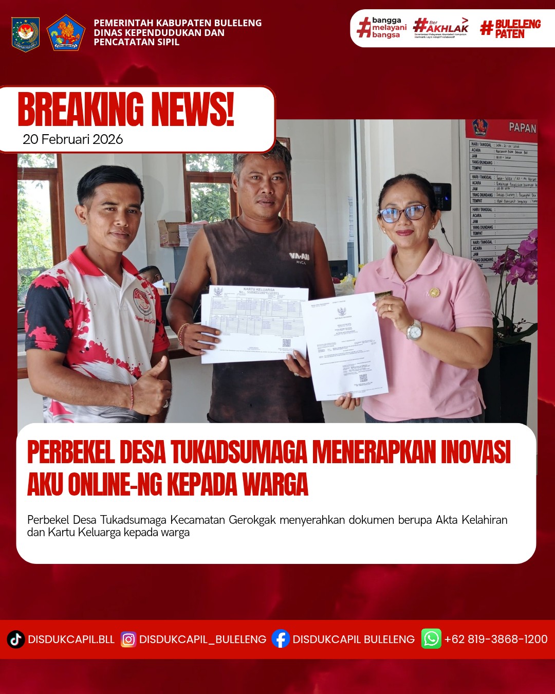 Pemerintah Kabupaten Buleleng melalui Dinas Kependudukan dan Pecatatan Sipil (Disdukcapil) Kabupaten Buleleng memaksimalkan serta mempermudah pelayanan kependudukan masyarakat dengan beberapa inovasi, melalui aplikasi AKU Online-NG. Dimana dalam penerapan aplikasi Aku Online-NG tersebut masyarakat tidak perlu lagi datang ke Dinas Dukcapil untuk melakukan pelayanan langsung cukup dengan datang ke Desa nanti akan dibantu oleh operator Desa masing-masing. Di Desa Tukadsumaga Kecamatan Gerokgak, telah diserahkan dokumen kependudukan berupa Akta Kelahiran atas nama Ni Kadek Ernika dan Kartu Keluarga atas nama I Kadek Widarpa yang diserahkan oleh Perbekel Desa Tukadsumaga Anak Agung Sri Wathi didampingi oleh Kelian Banjar Dinas Gandongan Ketut Wira Senadi Desa Tukadsumaga, Jumat (20/2).