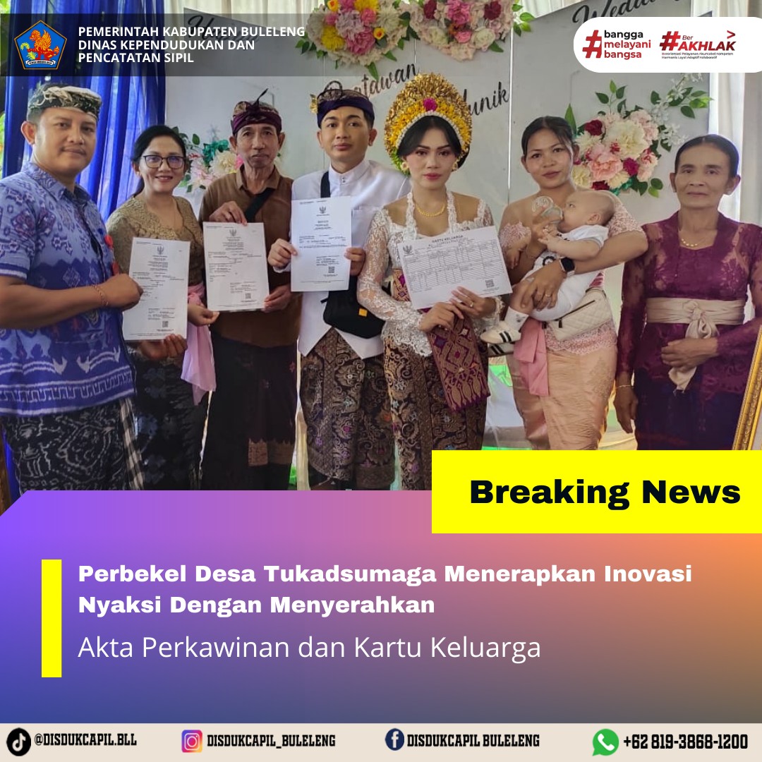 Pemerintah Kabupaten Buleleng melalui Dinas Kependudukan dan Pecatatan Sipil (Disdukcapil) Kabupaten Buleleng memaksimalkan serta mempermudah pelayanan kependudukan masyarakat dengan beberapa inovasi, yakni BALITA (Bayi Lahir Berakta), NYAKSI (Menyerahkan Akta Kawin Saat Acara Perkawinan) dan AKSAMA ( Akta Kematian Diserahkan Saat Masih Berduka) melalui aplikasi Aku Online-NG. Di Desa Tukadsumaga Kecamatan Gerokgak, telah diterapkan program NYAKSI (Menyerahkan Akta Perkawinan Saat Acara Perkawinan) yang dilakukan secara langsung oleh Perbekel Desa Tukadsumaga Anak Agung Sri Wathi di dampingi Kelian Banjar Dinas Gandongan Cemara PUTU SUTA MAHARTA dengan menyerahkan Akta Perkawinan atas nama dan Kartu Keluarga kepada kedua mempelai atas nama I MADE PARTAWAN KUSUMA DAN NI LUH YUNIK WIDIANI dan kartu keluarga masing-masing orang tua mempelai di Banjar Dinas Gandongan Cemara Desa Tukadsumaga Kecamatan Gerogak, Minggu (7/12).