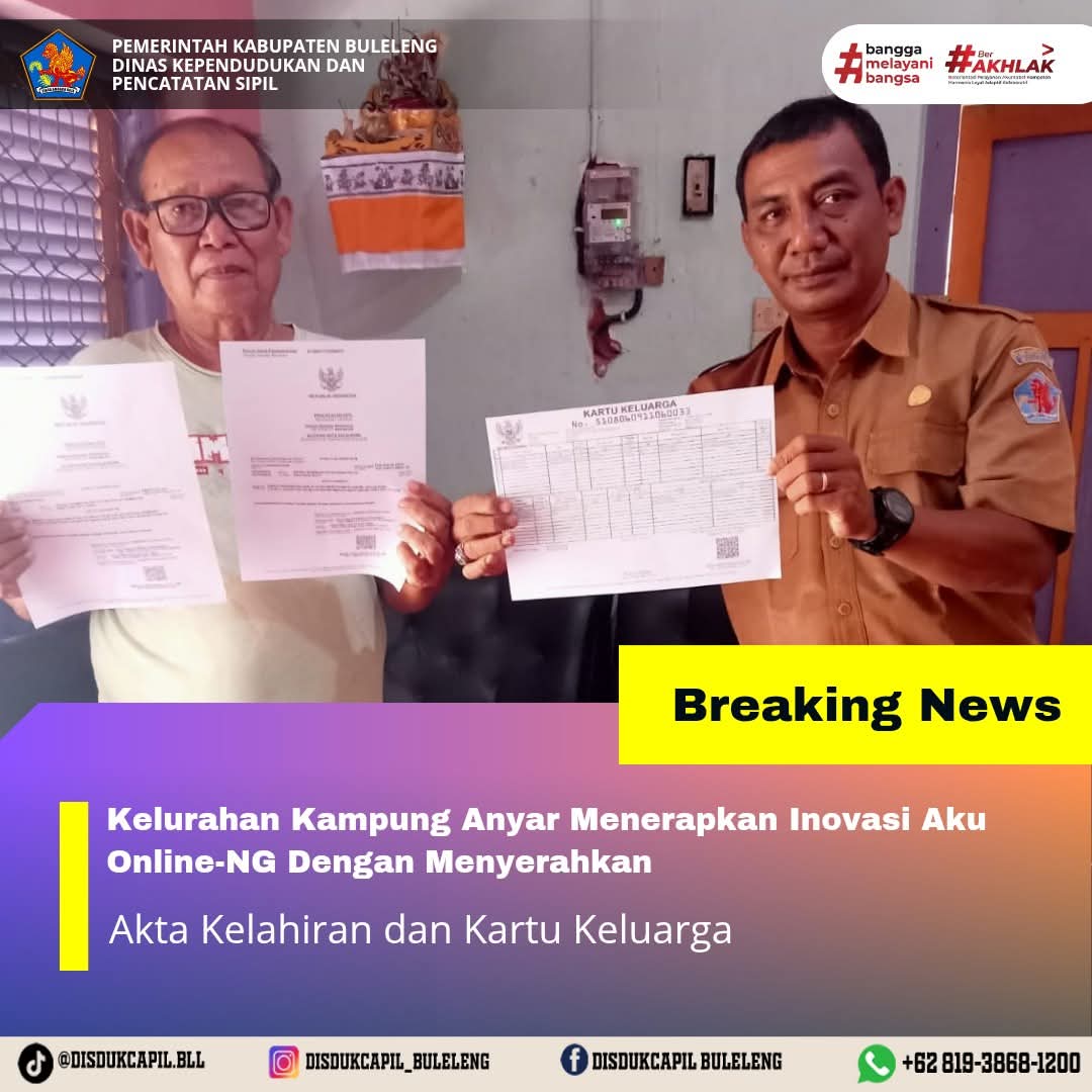 Pemerintah Kabupaten Buleleng melalui Dinas Kependudukan dan Pecatatan Sipil (Disdukcapil) Kabupaten Buleleng memaksimalkan serta mempermudah pelayanan kependudukan masyarakat dengan beberapa inovasi, melalui aplikasi AKU Online-NG. Dimana dalam penerapan aplikasi Aku Online-NG tersebut masyarakat tidak perlu lagi datang ke Dinas Dukcapil untuk melakukan pelayanan langsung cukup dengan datang ke Desa nanti akan dibantu oleh operator Desa masing-masing. Di Kelurahan Kampung Anyar Kecamatan Buleleng, telah diserahkan dokumen kependudukan berupa Akta Kelahiran atas nama Ketut Suartha dan Kartu Keluarga yang diserahkan langsung oleh Kelurahan Kampung Anyar Kecamatan Buleleng, Kabupaten Buleleng, Senin (29/12).