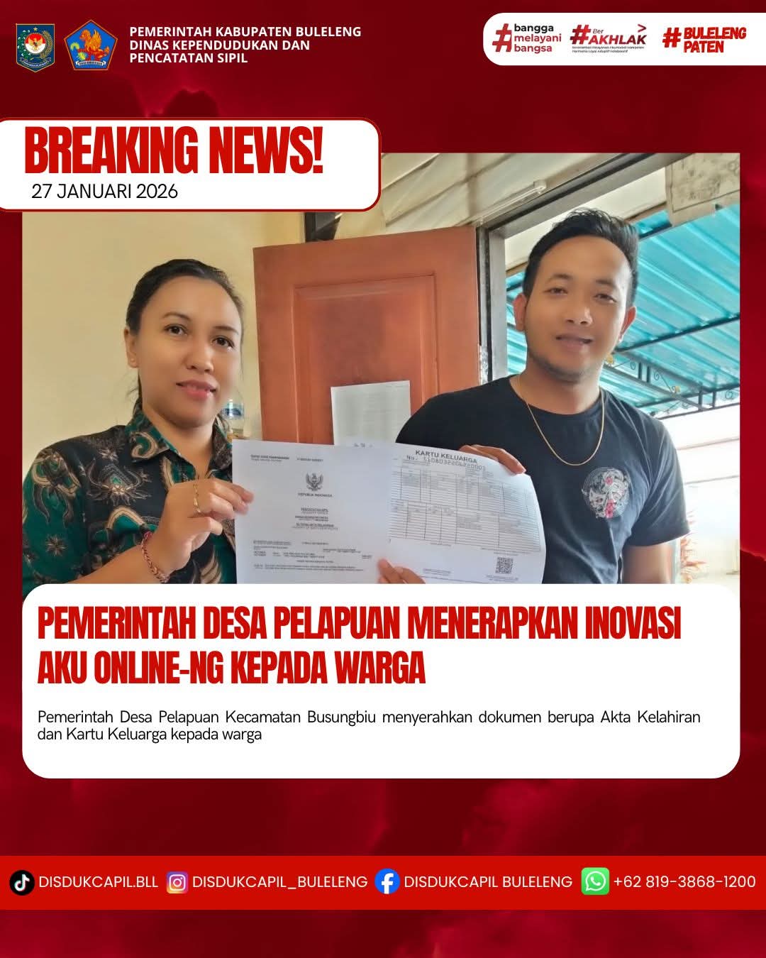 Pemerintah Kabupaten Buleleng melalui Dinas Kependudukan dan Pecatatan Sipil (Disdukcapil) Kabupaten Buleleng memaksimalkan serta mempermudah pelayanan kependudukan masyarakat dengan beberapa inovasi, melalui aplikasi AKU Online-NG. Dimana dalam penerapan aplikasi Aku Online-NG tersebut masyarakat tidak perlu lagi datang ke Dinas Dukcapil untuk melakukan pelayanan langsung cukup dengan datang ke Desa nanti akan dibantu oleh operator Desa masing-masing. Di Desa Pelapuan Kecamatan Busungbiu, telah diserahkan dokumen kependudukan berupa Akta Kelahiran dan Kartu Keluarga atas nama Kadek Reivan Nanjaya Putra warga Desa Pelapuan yang diserahkan oleh Kasi Pemerintahan Desa Pelapuan bertempat di Kantor Perbekel Desa Pelapuan, Kecamatan Busungbiu, Kabupaten Buleleng, Selasa (27/1).