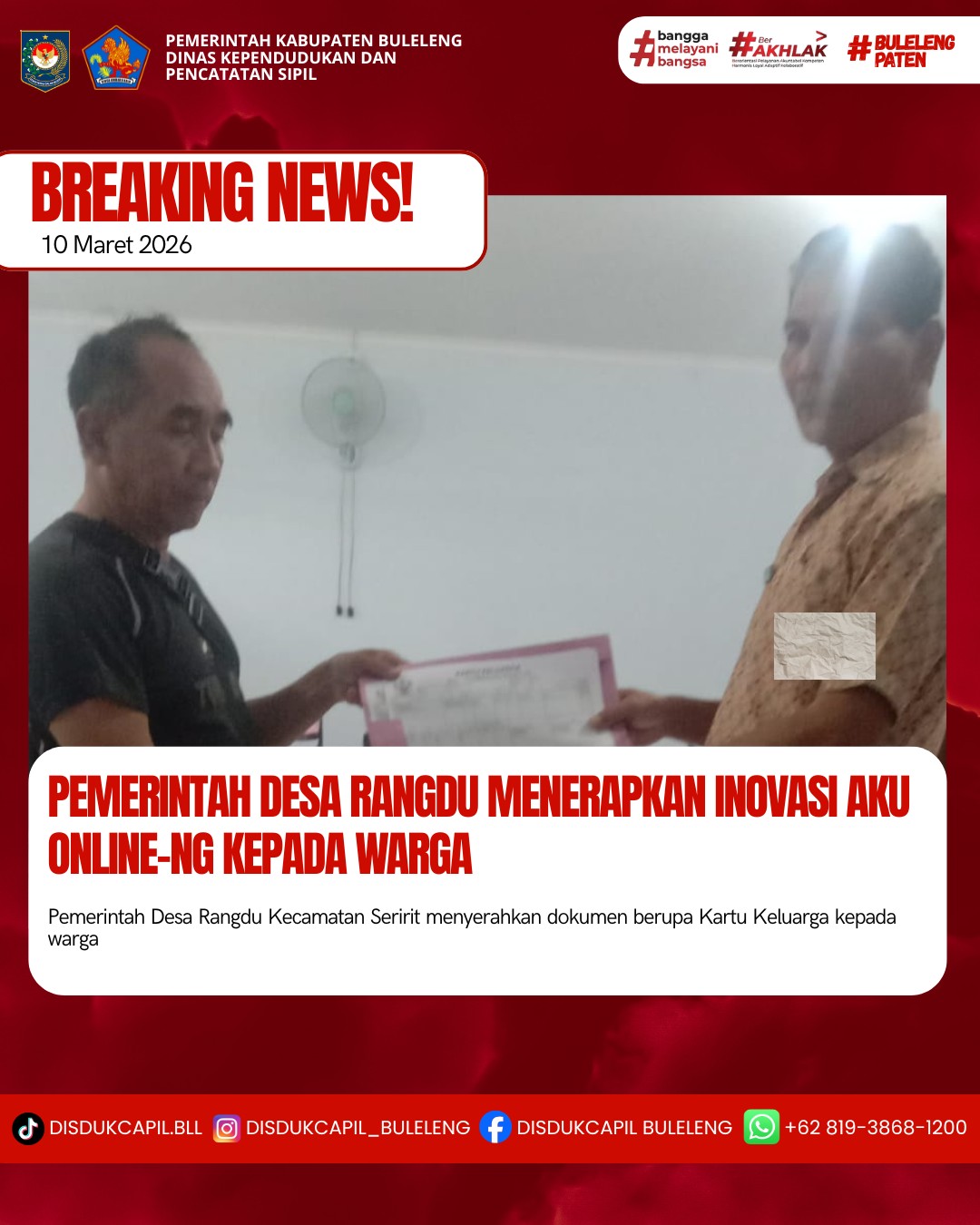 Pemerintah Kabupaten Buleleng melalui Dinas Kependudukan dan Pecatatan Sipil (Disdukcapil) Kabupaten Buleleng memaksimalkan serta mempermudah pelayanan kependudukan masyarakat dengan beberapa inovasi, melalui aplikasi AKU Online. Dimana dalam penerapan aplikasi Aku Online tersebut masyarakat tidak perlu lagi datang ke Dinas Dukcapil untuk melakukan pelayanan langsung cukup dengan datang ke Desa nanti akan dibantu oleh operator Desa masing-masing. Di Desa Rangdu Kecamatan Seririt telah diserahkan dokumen kependudukan berupa Kartu Keluarga atas nama I Made Tegeh diserahkan langsung oleh Kadus Karya Nadi I Made Suwastika di Desa Rangdu Kecamatan Seririt, Selasa (10/3).