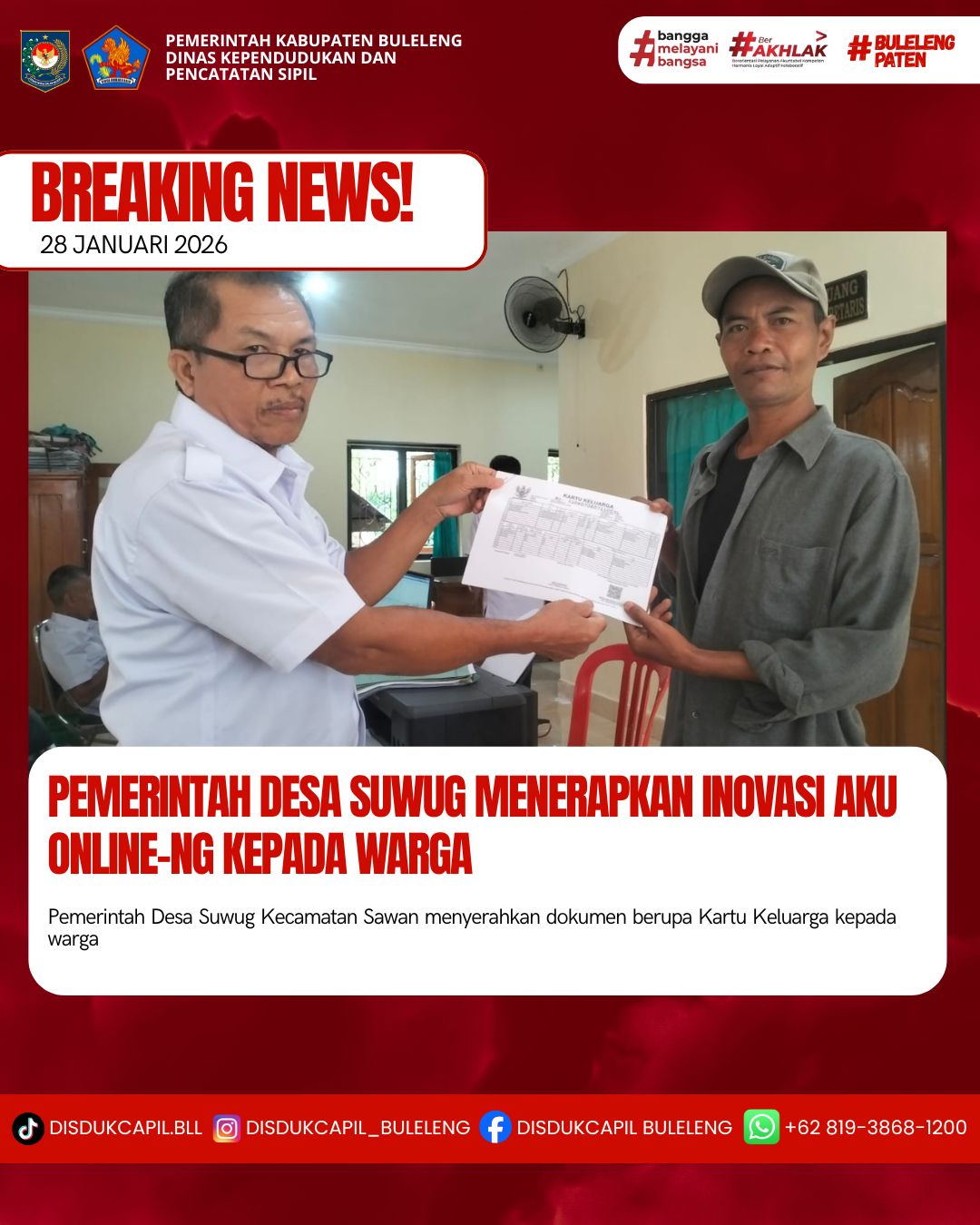 Pemerintah Kabupaten Buleleng melalui Dinas Kependudukan dan Pecatatan Sipil (Disdukcapil) Kabupaten Buleleng memaksimalkan serta mempermudah pelayanan kependudukan masyarakat dengan beberapa inovasi, melalui aplikasi AKU Online-NG. Dimana dalam penerapan aplikasi Aku Online-NG tersebut masyarakat tidak perlu lagi datang ke Dinas Dukcapil untuk melakukan pelayanan langsung cukup dengan datang ke Desa nanti akan dibantu oleh operator Desa masing-masing. Di Desa Suwug Kecamatan Sawan, Kasi Pemerintahan Desa Suwug telah menyerahkan dokumen kependudukan berupa Kartu Keluarga, Rabu (28/1).