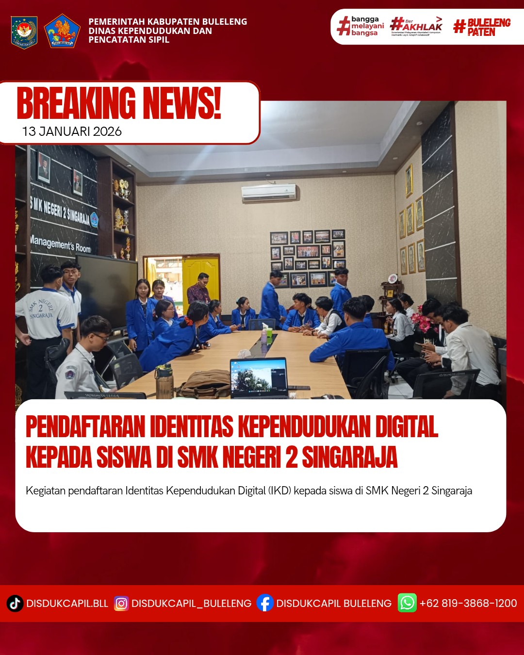 Menerapkan aturan pemerintah tersebut, Dinas Kependudukan dan Pencatatan Sipil Kabupaten Buleleng menyelenggarakan Pendaftaran Identitas Kependudukan Digital ke sekolah-sekolah, Dinas, Lembaga dan Perusahaan secara bergilir setiap harinya. Kali ini pelaksanaan pendaftaran Identitas Kependudukan Digital kepada siswa yang dilaksanakan di SMK Negeri 2 Singaraja, Selasa (13/1).