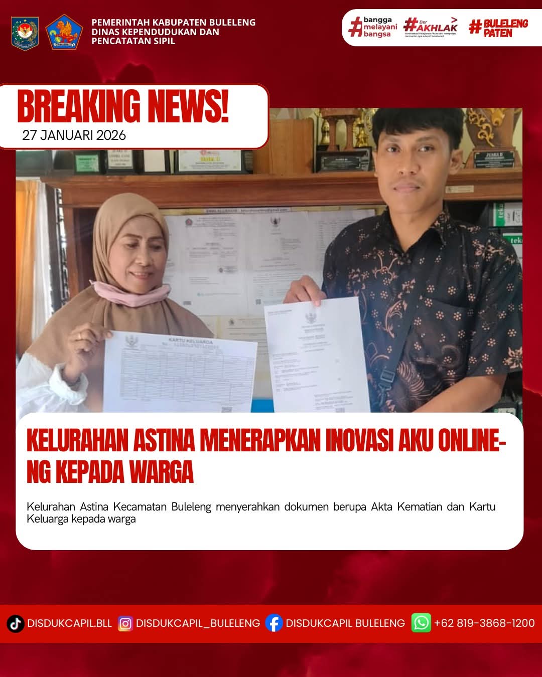 Pemerintah Kabupaten Buleleng melalui Dinas Kependudukan dan Pecatatan Sipil (Disdukcapil) Kabupaten Buleleng memaksimalkan serta mempermudah pelayanan kependudukan masyarakat dengan beberapa inovasi, melalui aplikasi AKU Online-NG. Dimana dalam penerapan aplikasi Aku Online-NG tersebut masyarakat tidak perlu lagi datang ke Dinas Dukcapil untuk melakukan pelayanan langsung cukup dengan datang ke Desa nanti akan dibantu oleh operator Desa masing-masing. Di Kelurahan Astina Kecamatan Buleleng, telah diserahkan dokumen kependudukan berupa Akta Kematian dan Kartu Keluarga yang diserahkan langsung oleh Operator Kelurahan Astina Kecamatan Buleleng, Kabupaten Buleleng, Senin (26/1).