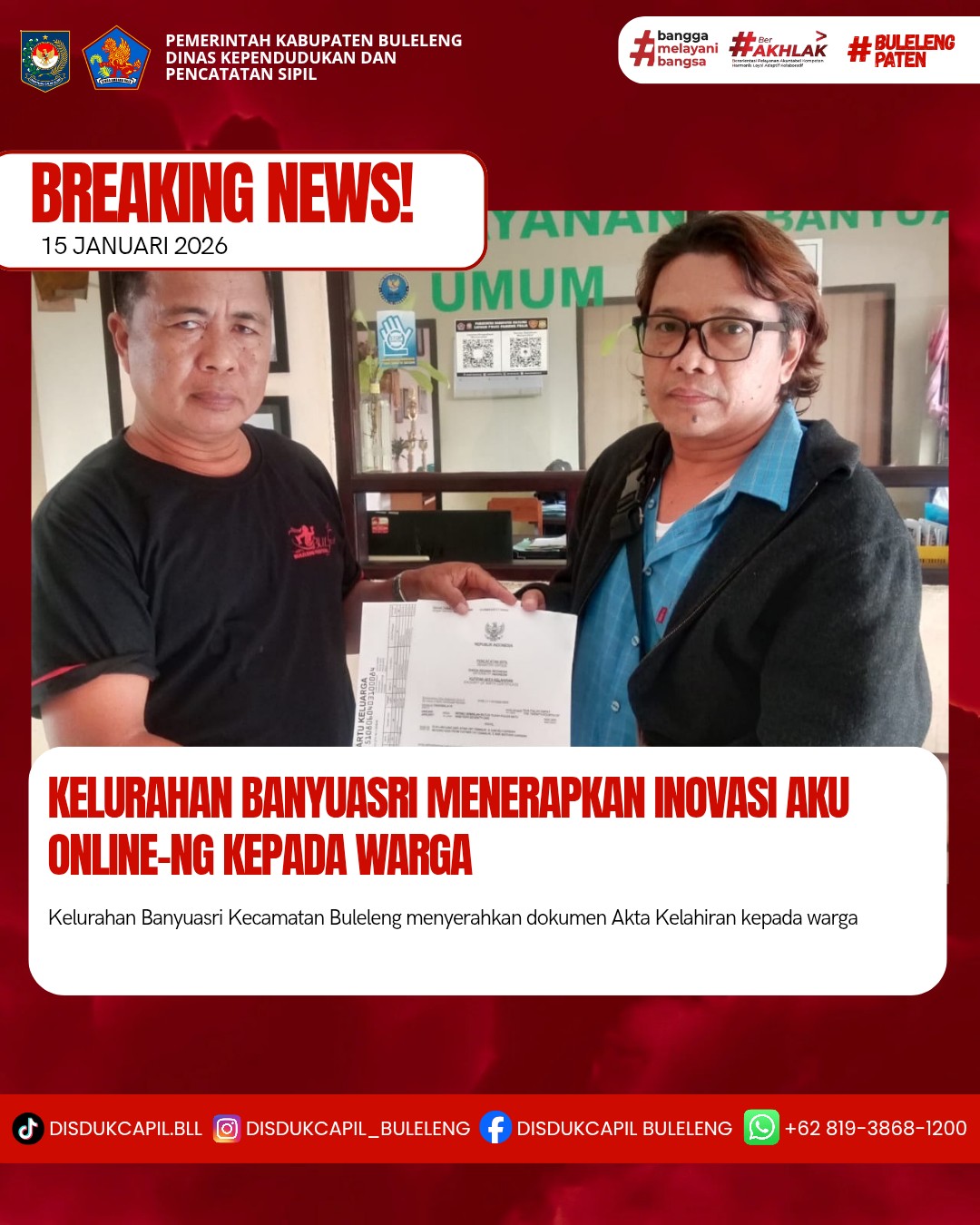 Pemerintah Kabupaten Buleleng melalui Dinas Kependudukan dan Pecatatan Sipil (Disdukcapil) Kabupaten Buleleng memaksimalkan serta mempermudah pelayanan kependudukan masyarakat dengan beberapa inovasi, melalui aplikasi AKU Online-NG. Dimana dalam penerapan aplikasi Aku Online-NG tersebut masyarakat tidak perlu lagi datang ke Dinas Dukcapil untuk melakukan pelayanan langsung cukup dengan datang ke Desa nanti akan dibantu oleh operator Desa masing-masing. Di Kelurahan Banyuasri Kecamatan Buleleng, telah diserahkan dokumen kependudukan berupa Akta Kelahiran nama Ismail yang beralamat di Jalan Ayani Gang Dewi Sita Kelurahan Banyuasri yang diserahkan langsung oleh Kasi Pembangunan Kelurahan Banyuasri, Kecamatan Buleleng, Kabupaten Buleleng, Kamis (15/1).