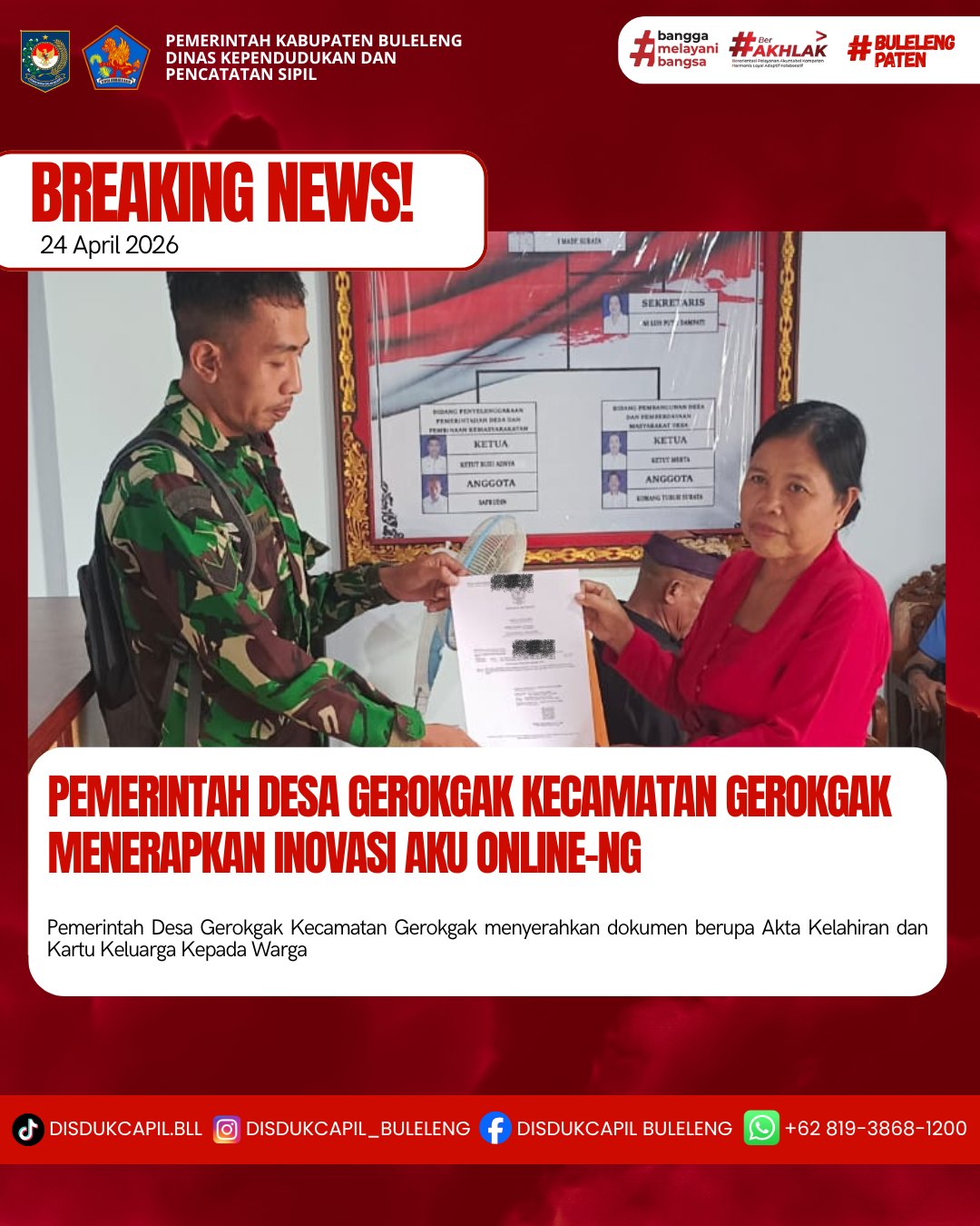 Pemerintah Kabupaten Buleleng melalui Dinas Kependudukan dan Pecatatan Sipil (Disdukcapil) Kabupaten Buleleng memaksimalkan serta mempermudah pelayanan kependudukan masyarakat dengan beberapa inovasi, melalui aplikasi AKU Online-NG. Dimana dalam penerapan aplikasi Aku Online-NG tersebut masyarakat tidak perlu lagi datang ke Dinas Dukcapil untuk melakukan pelayanan langsung, cukup dengan datang ke Desa nanti akan dibantu oleh operator Desa masing-masing. Di Desa Gerokgak Kecamatan Gerokgak, telah diserahkan dokumen kependudukan berupa Akta Kelahiran anak an. Made Kinan Wiraguna Kusuma Arta dan penyerahan KK an. Komang Sumiarta Banjar Dinas Tamansari yang diserahkan langsung oleh Kasi Pemerintahan Desa Gerokgak, di Kecamatan Gerokgak, Kabupaten Buleleng, Jumat (24/4).