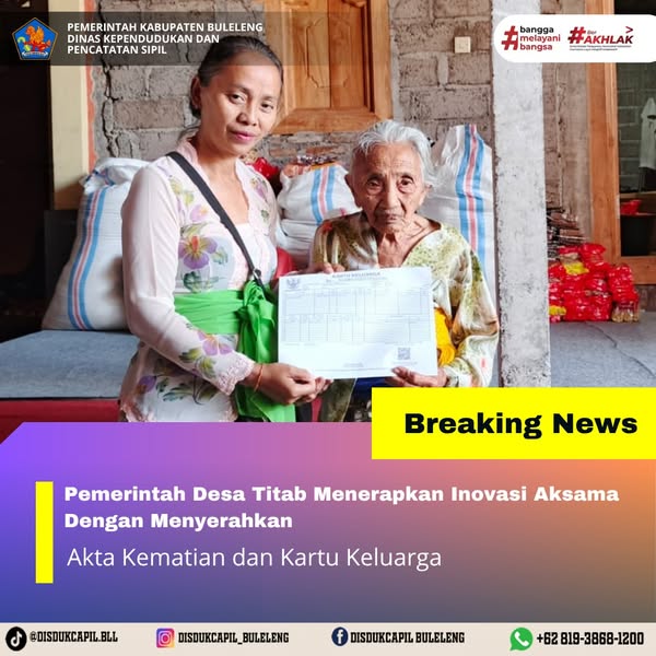 Pemerintah Kabupaten Buleleng melalui Dinas Kependudukan dan Pecatatan Sipil (Disdukcapil) Kabupaten Buleleng memaksimalkan serta mempermudah pelayanan kependudukan masyarakat dengan beberapa inovasi, yakni BALITA (Bayi Lahir Berakta), NYAKSI (Menyerahkan Akta Kawin Saat Acara Perkawinan) dan AKSAMA ( Akta Kematian Diserahkan Saat Masih Berduka) melalui aplikasi Aku Online-NG. Di Desa Titab Kecamatan Busungbiu, telah diterapkan program Aksama (Akta Kematian Diserahkan Saat Masih Berduka) yang dilakukan secara langsung oleh Pemerintah Desa Titab Kecamatan Busungbiu dengan menyerahkan Akta Kematian atas nama GUSTI KOMPIANG TJAKRA dan Kartu Keluarga atas nama GUSTI KETUT SEKAR kepada pihak keluarga almarhum dari Banjar Dinas Angsanasari di Desa Titab Kecamatan Busungbiu, Kamis (10/7).