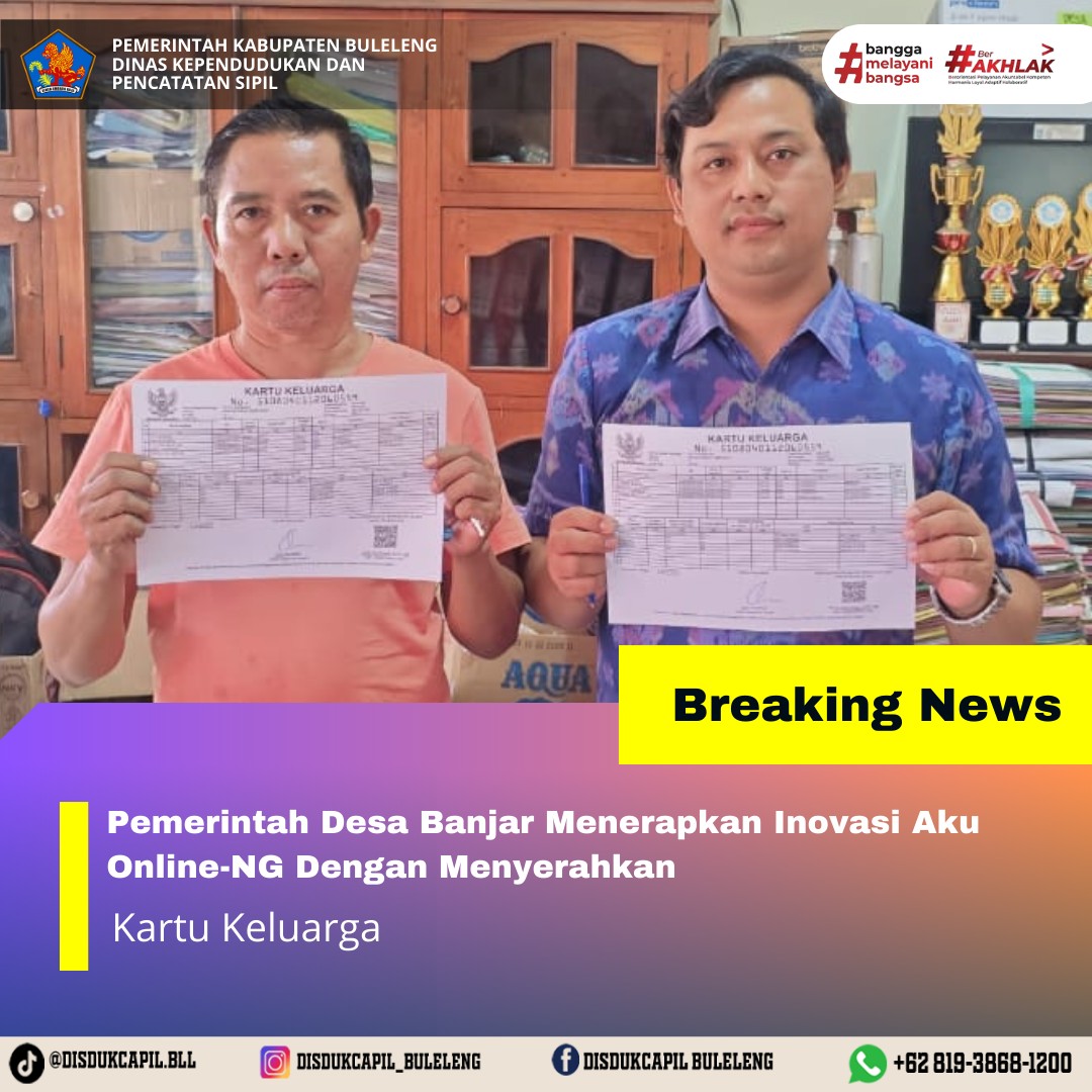 Pemerintah Kabupaten Buleleng melalui Dinas Kependudukan dan Pecatatan Sipil (Disdukcapil) Kabupaten Buleleng memaksimalkan serta mempermudah pelayanan kependudukan masyarakat dengan beberapa inovasi, melalui aplikasi AKU Online-NG. Dimana dalam penerapan aplikasi Aku Online-NG tersebut masyarakat tidak perlu lagi datang ke Dinas Dukcapil untuk melakukan pelayanan langsung cukup dengan datang ke Desa nanti akan dibantu oleh operator Desa masing-masing. Di Desa Banjar Kecamatan Banjar, telah diserahkan dokumen kependudukan berupa Kartu Keluarga atas nama PUTU NUGRAHA yang beralamat di Banjar Dinas Ambengan, Desa Banjar yang diserahkan langsung oleh Pemerintahan Desa Banjar, Rabu (20/8).