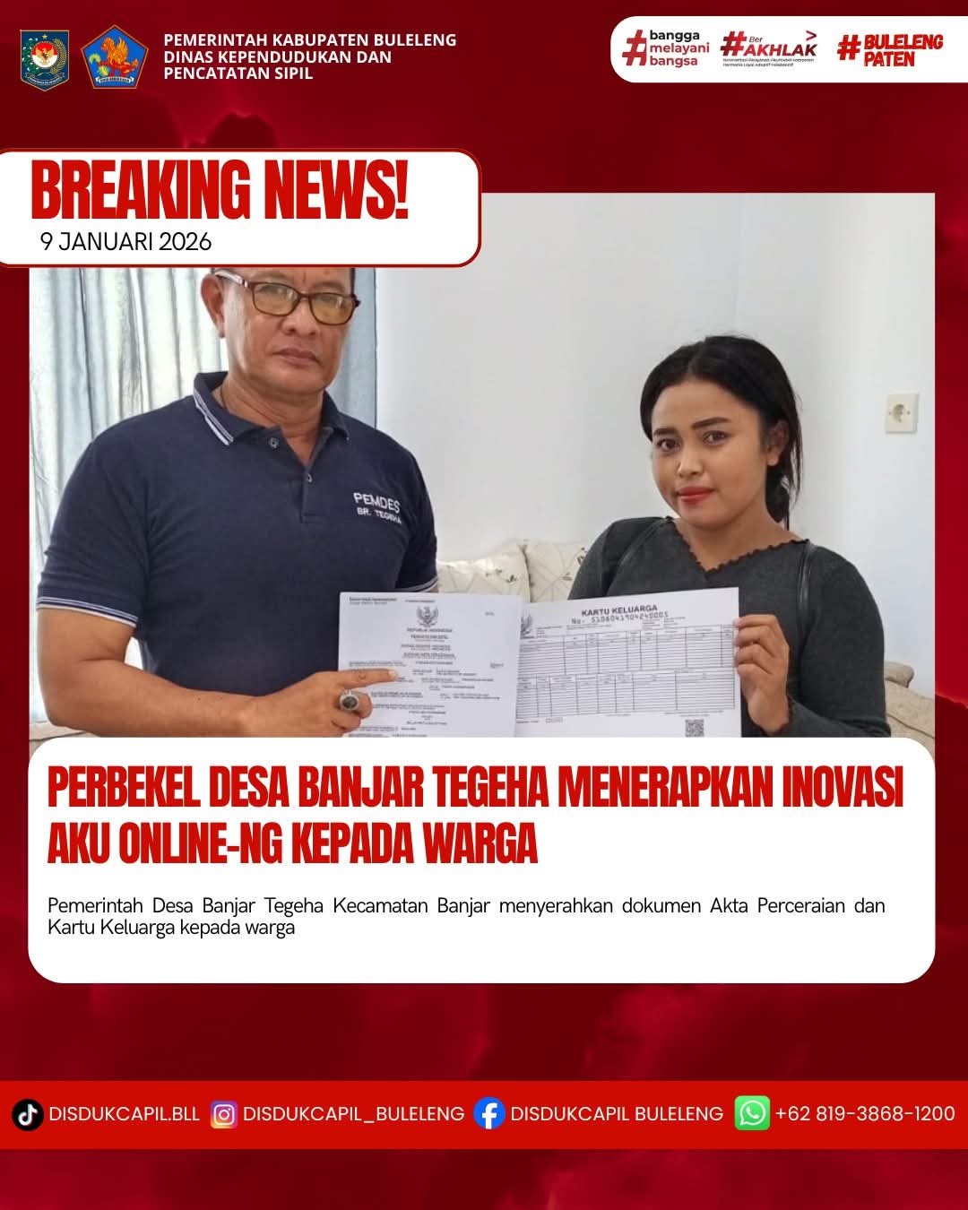 Pemerintah Kabupaten Buleleng melalui Dinas Kependudukan dan Pecatatan Sipil (Disdukcapil) Kabupaten Buleleng memaksimalkan serta mempermudah pelayanan kependudukan masyarakat dengan beberapa inovasi, melalui aplikasi AKU Online-NG. Dimana dalam penerapan aplikasi Aku Online-NG tersebut masyarakat tidak perlu lagi datang ke Dinas Dukcapil untuk melakukan pelayanan langsung cukup dengan datang ke Desa nanti akan dibantu oleh operator Desa masing-masing. Di Desa Banjar Tegeha Kecamatan Banjar, telah diserahkan dokumen kependudukan berupa Akta Perceraian dan Kartu Keluarga atas nama Ni Luh Putu Sulistyani warga Banjar Dinas Tangeb Desa Banjar Tegeha yang diserahkan secara langsung oleh Perbekel Desa Banjar Tegeha Ida Bagus Komang Sistiadi, Jumat (9/1).