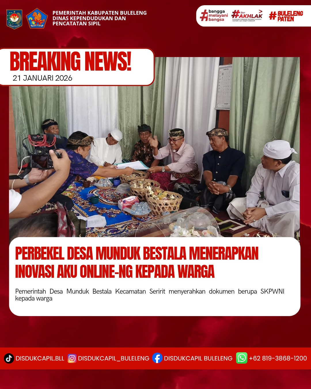 Pemerintah Kabupaten Buleleng melalui Dinas Kependudukan dan Pecatatan Sipil (Disdukcapil) Kabupaten Buleleng memaksimalkan serta mempermudah pelayanan kependudukan masyarakat dengan beberapa inovasi, melalui aplikasi AKU Online-NG. Dimana dalam penerapan aplikasi Aku Online-NG tersebut masyarakat tidak perlu lagi datang ke Dinas Dukcapil untuk melakukan pelayanan langsung cukup dengan datang ke Desa nanti akan dibantu oleh operator Desa masing-masing. Di Desa Munduk Bestala Kecamatan Seririt, telah diserahkan dokumen kependudukan berupa Surat Pindah Domisili (SKPWNI) atas nama Komang Elly Merlina yang diserahkan secara langsung oleh Perbekel Desa Munduk Bestala I Putu Sriyasa,SH kepada perwakilan dari Kelurahan Banyuning, Rabu (21/1).