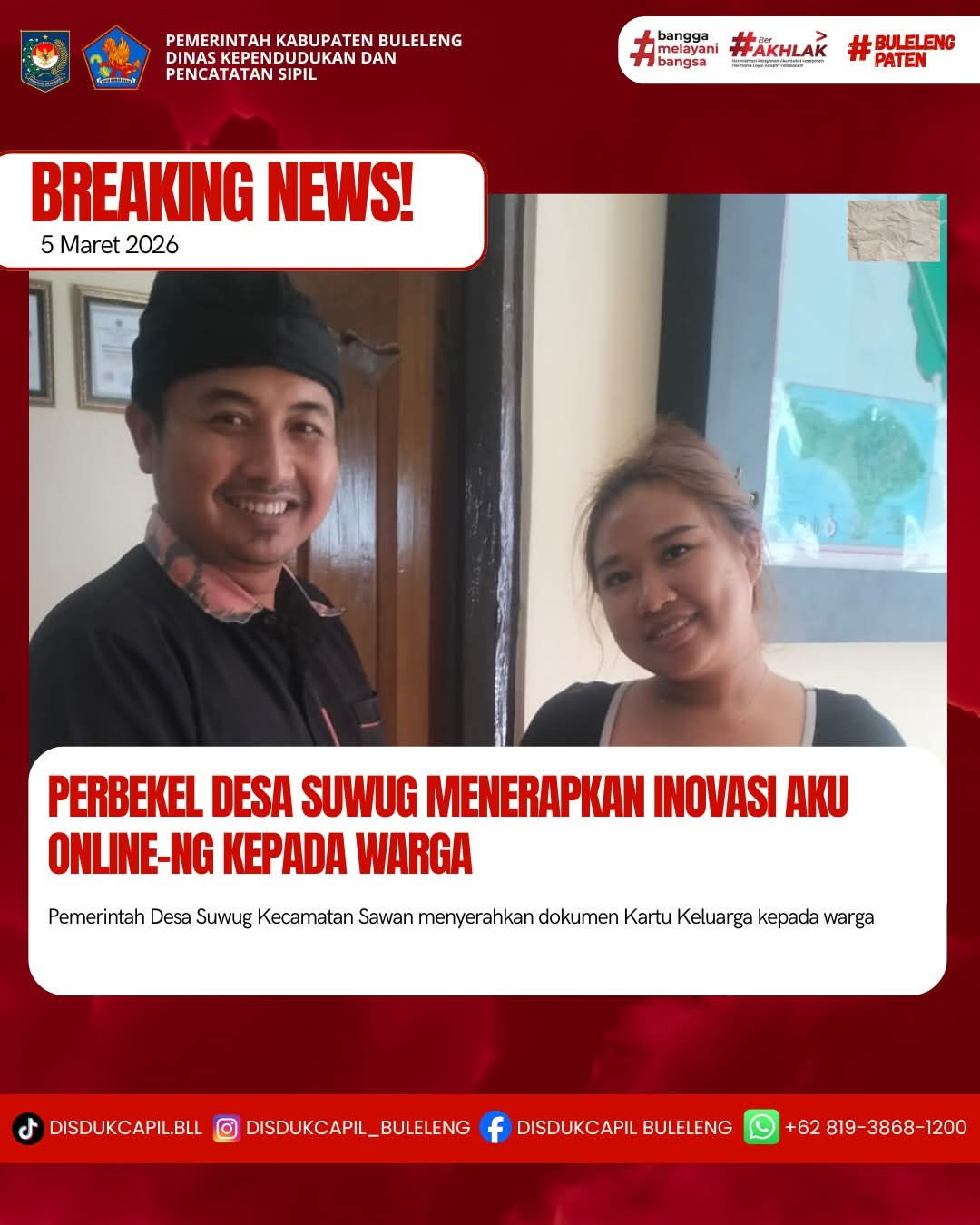 Pemerintah Kabupaten Buleleng melalui Dinas Kependudukan dan Pecatatan Sipil (Disdukcapil) Kabupaten Buleleng memaksimalkan serta mempermudah pelayanan kependudukan masyarakat dengan beberapa inovasi, melalui aplikasi AKU Online-NG. Dimana dalam penerapan aplikasi Aku Online-NG tersebut masyarakat tidak perlu lagi datang ke Dinas Dukcapil untuk melakukan pelayanan langsung cukup dengan datang ke Desa nanti akan dibantu oleh operator Desa masing-masing. Di Desa Suwug Kecamatan Sawan, Bapak Perbekel Desa Suwug KETUT SUADNYANA,SE telah menyerahkan dokumen kependudukan berupa Kartu Keluarga yang diserahkan secara lansung oleh Perbekel Desa Suwug, Kamis (5/3).