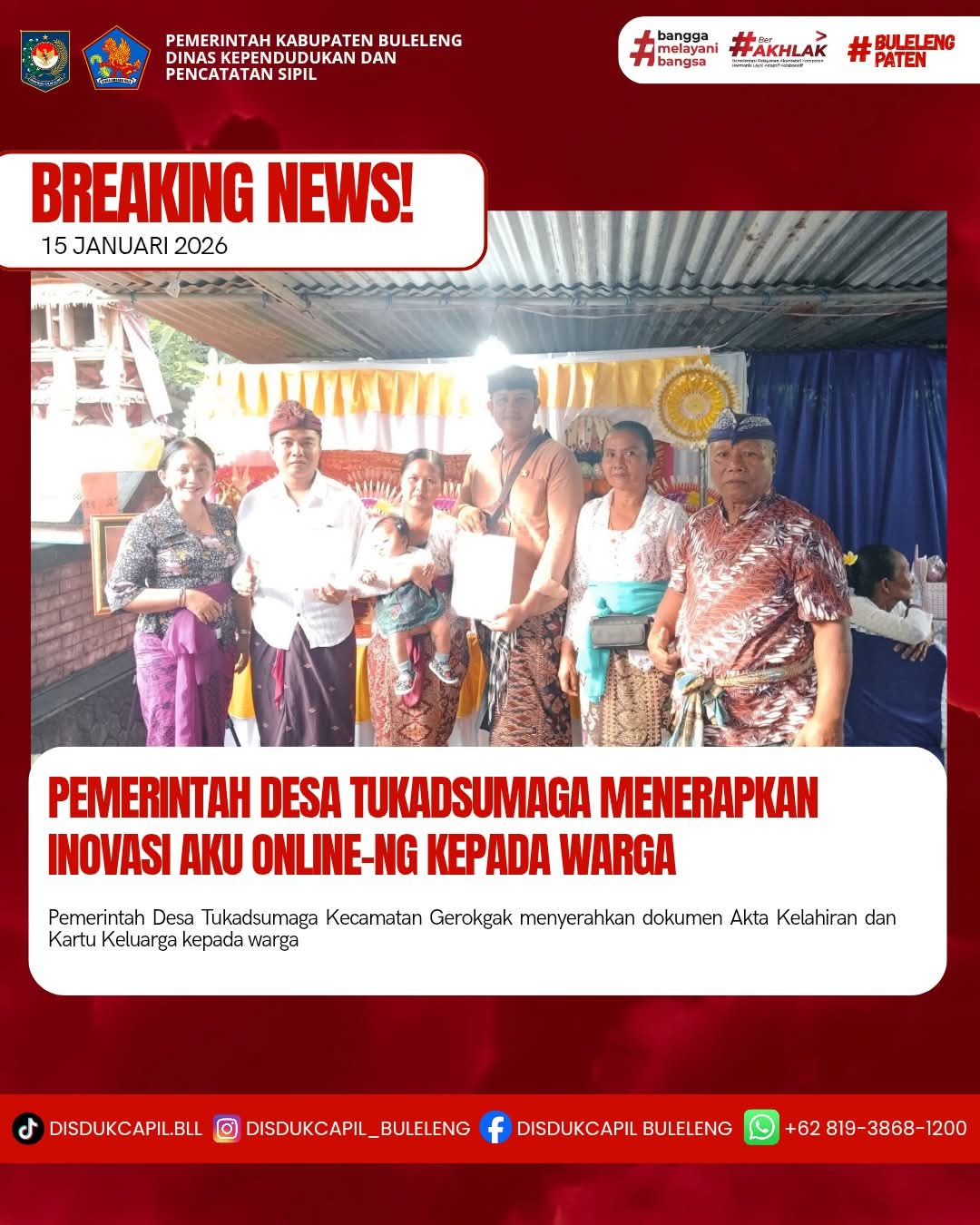 Pemerintah Kabupaten Buleleng melalui Dinas Kependudukan dan Pecatatan Sipil (Disdukcapil) Kabupaten Buleleng memaksimalkan serta mempermudah pelayanan kependudukan masyarakat dengan beberapa inovasi, melalui aplikasi AKU Online-NG. Dimana dalam penerapan aplikasi Aku Online-NG tersebut masyarakat tidak perlu lagi datang ke Dinas Dukcapil untuk melakukan pelayanan langsung cukup dengan datang ke Desa nanti akan dibantu oleh operator Desa masing-masing. Di Desa Tukadsumaga Kecamatan Gerokgak, telah diserahkan dokumen kependudukan berupa Akta Kelahiran dan Kartu Keluarga warga Banjar Dinas Gandongan Cemara Desa Tukadsumaga Kecamatan Gerokgak yang diserahkan oleh Perbekel Desa Tukadsumaga Anak Agung Sri Wathi di Desa Tukadsumaga, Kamis (15/1).
