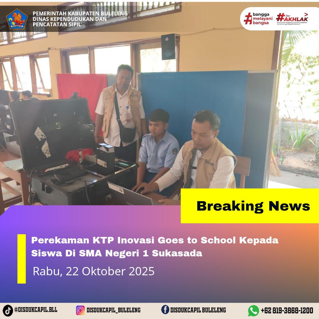 Pada kali ini Rabu, 22 Oktober 2025 pelayanan perekaman KTP-el dilaksanakan di SMA Negeri 1 Sukasada. Hasil perekaman di SMA Negeri 1 Sukasada dengan data BNBA sebanyak 22 orang dan total yang melakukan perekaman sebanyak 43 orang, dimana hasil perekaman data di dalam BNBA yang melakukan perekaman sebanyak 21 orang dan data di luar BNBA sebanyak 22 orang yang melakukan perekaman. Sisa data BNBA yang belum perekaman adalah 1 orang, menurut keterangan pihak sekolah sudah diumumkan tapi tetap tidak hadir.