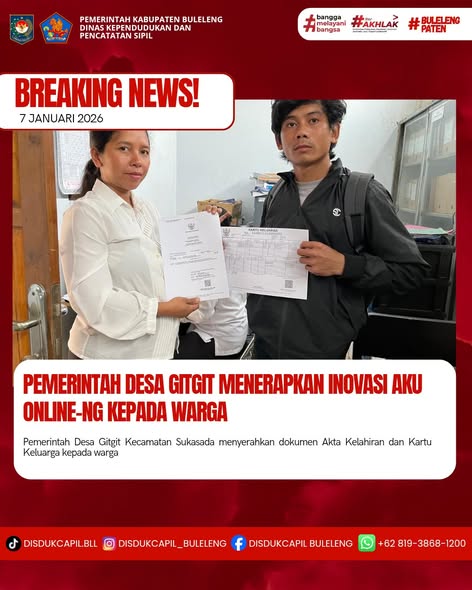 Pemerintah Kabupaten Buleleng melalui Dinas Kependudukan dan Pecatatan Sipil (Disdukcapil) Kabupaten Buleleng memaksimalkan serta mempermudah pelayanan kependudukan masyarakat dengan beberapa inovasi, melalui aplikasi AKU Online-NG. Dimana dalam penerapan aplikasi Aku Online-NG tersebut masyarakat tidak perlu lagi datang ke Dinas Dukcapil untuk melakukan pelayanan langsung cukup dengan datang ke Desa nanti akan dibantu oleh operator Desa masing-masing. Di Desa Gitgit Kecamatan Sukasada, telah diserahkan dokumen kependudukan berupa Akta Kelahiran dan Kartu Keluarga atas nama Kadek Suardana yang diserahkan secara langsung oleh Kasi Pelayanan Desa Gitgit Kecamatan Sukasada kepada warga di Desa Gitgit Kecamatan Sukasada,Kabupaten Buleleng, Rabu (7/1).