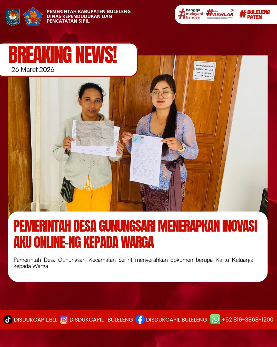 Pemerintah Kabupaten Buleleng melalui Dinas Kependudukan dan Pecatatan Sipil (Disdukcapil) Kabupaten Buleleng memaksimalkan serta mempermudah pelayanan kependudukan masyarakat dengan beberapa inovasi, melalui aplikasi AKU Online-NG. Dimana dalam penerapan aplikasi Aku Online-NG tersebut masyarakat tidak perlu lagi datang ke Dinas Dukcapil untuk melakukan pelayanan langsung, cukup dengan datang ke Desa nanti akan dibantu oleh operator Desa masing-masing. Di Desa Gunungsari Kecamatan Seririt, telah diserahkan dokumen kependudukan berupa Kartu Keluarga atas nama KETUT SUMARDIKAYASA dan KTP atas nama NI LUH ARIS YULIAWATI warga Banjar Dinas Sekar, Desa Gunungsari yang diserahkan oleh Pemerintah Desa Gunungsari kepada warga Banjar Dinas Sekar, bertempat di Kantor Perbekel Desa Gunungsari, Kecamatan Seririt, Kabupaten Buleleng, Kamis (26/3).
