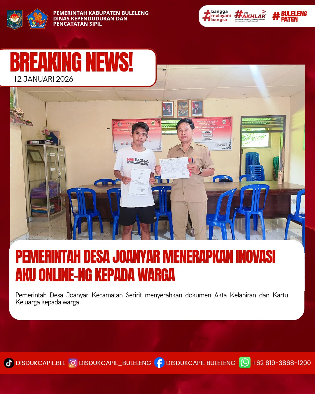 Pemerintah Kabupaten Buleleng melalui Dinas Kependudukan dan Pecatatan Sipil (Disdukcapil) Kabupaten Buleleng memaksimalkan serta mempermudah pelayanan kependudukan masyarakat dengan beberapa inovasi, melalui aplikasi AKU Online-NG. Dimana dalam penerapan aplikasi Aku Online-NG tersebut masyarakat tidak perlu lagi datang ke Dinas Dukcapil untuk melakukan pelayanan langsung cukup dengan datang ke Desa nanti akan dibantu oleh operator Desa masing-masing. Di Desa Joanyar Kecamatan Seririt, telah diserahkan dokumen kependudukan berupa Akta Kelahiran dan Kartu Keluarga atas nama Gede Ari Atna Yasa yang diserahkan secara langsung oleh Kasi Pemerintahan Desa Joanyar Kecamatan Seririt, Senin (12/1).