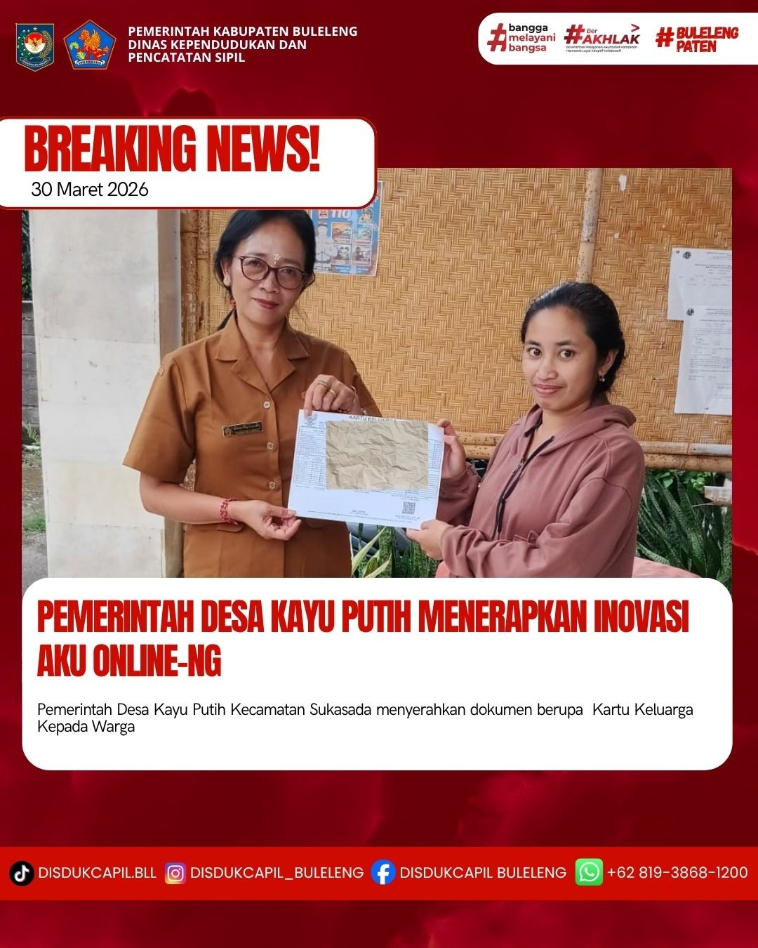 Pemerintah Kabupaten Buleleng melalui Dinas Kependudukan dan Pecatatan Sipil (Disdukcapil) Kabupaten Buleleng memaksimalkan serta mempermudah pelayanan kependudukan masyarakat dengan beberapa inovasi, melalui aplikasi AKU Online-NG. Dimana dalam penerapan aplikasi Aku Online-NG tersebut masyarakat tidak perlu lagi datang ke Dinas Dukcapil untuk melakukan pelayanan langsung cukup dengan datang ke Desa nanti akan dibantu oleh operator Desa masing-masing. Di Desa Kayu Putih Kecamatan Sukasada, telah diserahkan dokumen kependudukan berupa Kartu Keluarga atas nama Kadek Sukrada warga Banjar Dinas Melaka, Desa Kayu Putih, Kecamatan Sukasada yang diserahkan secara langsung oleh Kelian Banjar Dinas Melaka Desa Kayu Putih Kecamatan Sukasada, Senin (30/3).