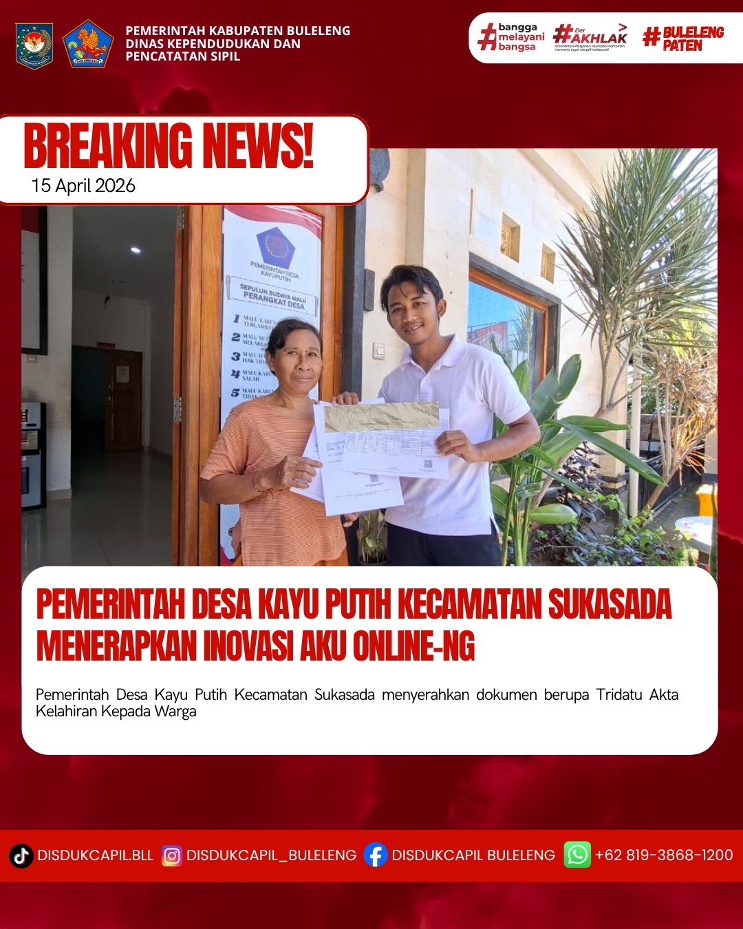 Pemerintah Kabupaten Buleleng melalui Dinas Kependudukan dan Pecatatan Sipil (Disdukcapil) Kabupaten Buleleng memaksimalkan serta mempermudah pelayanan kependudukan masyarakat dengan beberapa inovasi, melalui aplikasi AKU Online-NG. Dimana dalam penerapan aplikasi Aku Online-NG tersebut masyarakat tidak perlu lagi datang ke Dinas Dukcapil untuk melakukan pelayanan langsung cukup dengan datang ke Desa nanti akan dibantu oleh operator Desa masing-masing. Di Desa Kayu Putih Kecamatan Sukasada, telah diserahkan dokumen kependudukan berupa Akta Kelahiran atas nama Ketut Artika dan Ni Ketut Sukarini dan Kartu Keluarga atas nama Ketut Artika yang diserahkan secara langsung oleh Kasi Pelayanan Desa Kayu Putih Kecamatan Sukasada, Rabu (15/4).