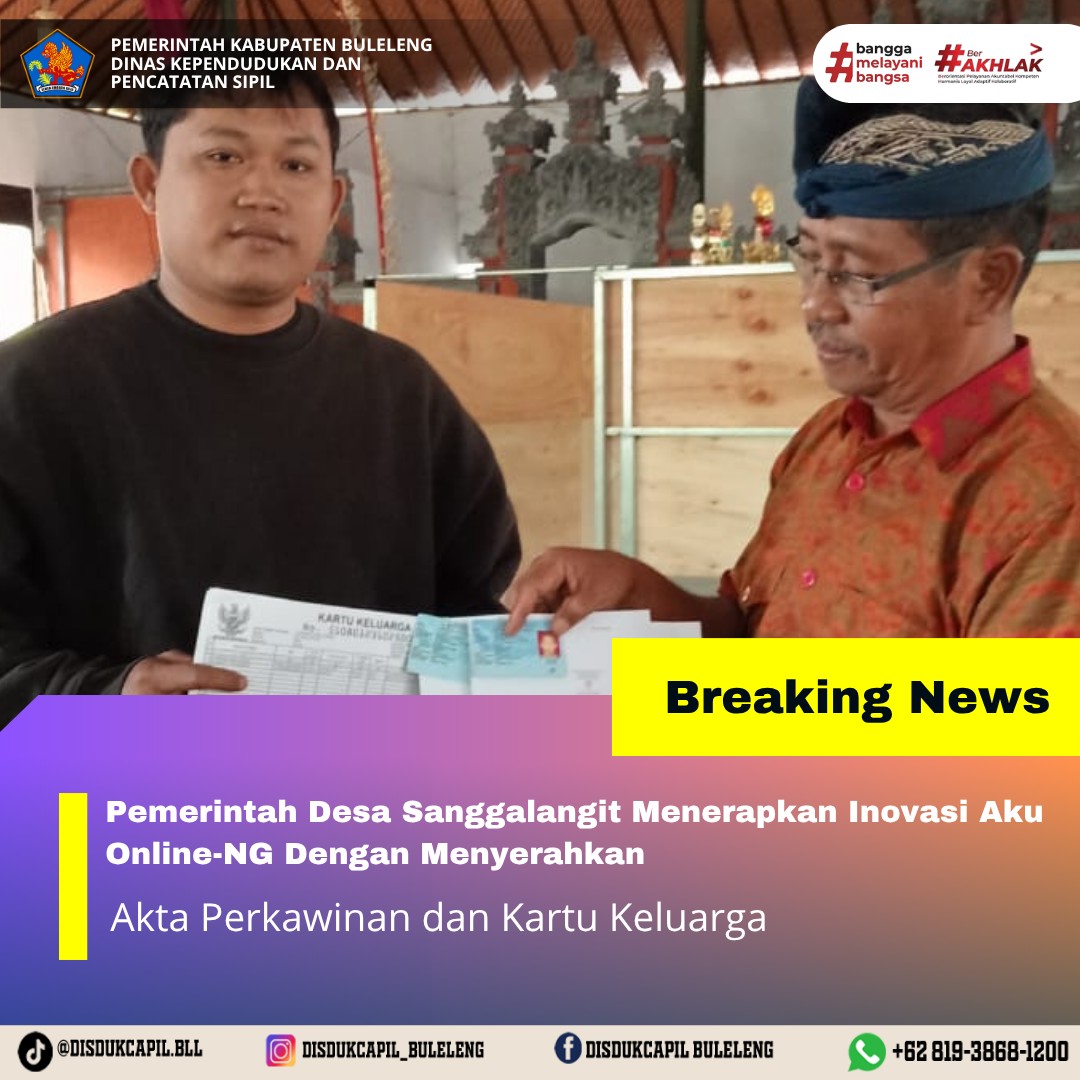 Pemerintah Kabupaten Buleleng melalui Dinas Kependudukan dan Pecatatan Sipil (Disdukcapil) Kabupaten Buleleng memaksimalkan serta mempermudah pelayanan kependudukan masyarakat dengan beberapa inovasi, melalui aplikasi AKU Online. Dimana dalam penerapan aplikasi Aku Online tersebut masyarakat tidak perlu lagi datang ke Dinas Dukcapil untuk melakukan pelayanan langsung cukup dengan datang ke Desa nanti akan dibantu oleh operator Desa masing-masing. Di Desa Sanggalangit Kecamatan Gerokgak telah diserahkan dokumen kependudukan berupa Akta Perkawinan dan Kartu Keluarga kepada warga Desa Sanggalangit atas nama I Komang Dana Ariasa yang diserahkan oleh Perbekel Desa Sanggalangit Kecamatan Gerokgak I Nyoman Sudika, Jumat (31/10).