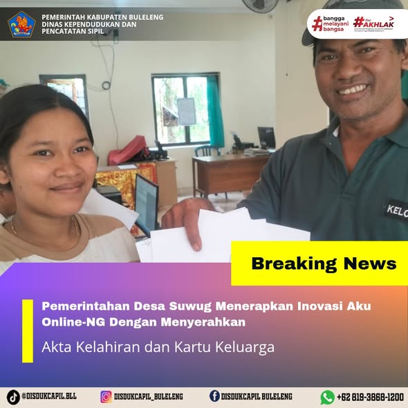 Pemerintah Kabupaten Buleleng melalui Dinas Kependudukan dan Pecatatan Sipil (Disdukcapil) Kabupaten Buleleng memaksimalkan serta mempermudah pelayanan kependudukan masyarakat dengan beberapa inovasi, melalui aplikasi AKU Online-NG. Dimana dalam penerapan aplikasi Aku Online-NG tersebut masyarakat tidak perlu lagi datang ke Dinas Dukcapil untuk melakukan pelayanan langsung cukup dengan datang ke Desa nanti akan dibantu oleh operator Desa masing-masing. Di Desa Suwug Kecamatan Sawan, Pemerintahan Desa telah menyerahkan dokumen kependudukan berupa Akta Kelahiran dan Kartu Keluarga, Rabu (26/11).