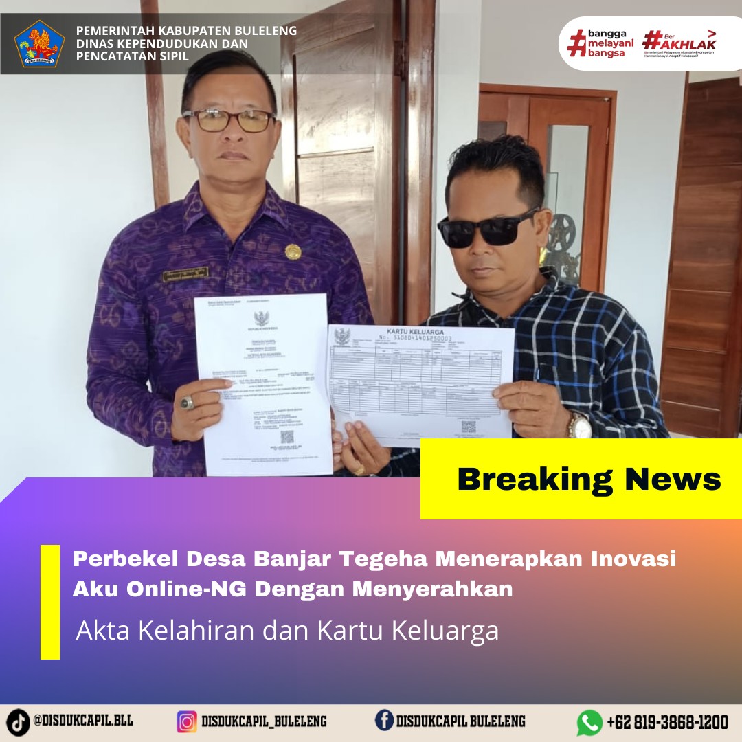 Pemerintah Kabupaten Buleleng melalui Dinas Kependudukan dan Pecatatan Sipil (Disdukcapil) Kabupaten Buleleng memaksimalkan serta mempermudah pelayanan kependudukan masyarakat dengan beberapa inovasi, melalui aplikasi AKU Online-NG. Dimana dalam penerapan aplikasi Aku Online-NG tersebut masyarakat tidak perlu lagi datang ke Dinas Dukcapil untuk melakukan pelayanan langsung cukup dengan datang ke Desa nanti akan dibantu oleh operator Desa masing-masing. Di Desa Banjar Tegeha Kecamatan Banjar, telah diserahkan dokumen kependudukan berupa Akta Kelahiran dan Kartu Keluarga warga atas nama Gede Sujayana diserahkan secara langsung oleh Perbekel Desa Banjar Tegeha Ida Bagus Komang Sistiadi, Selasa (9/9).