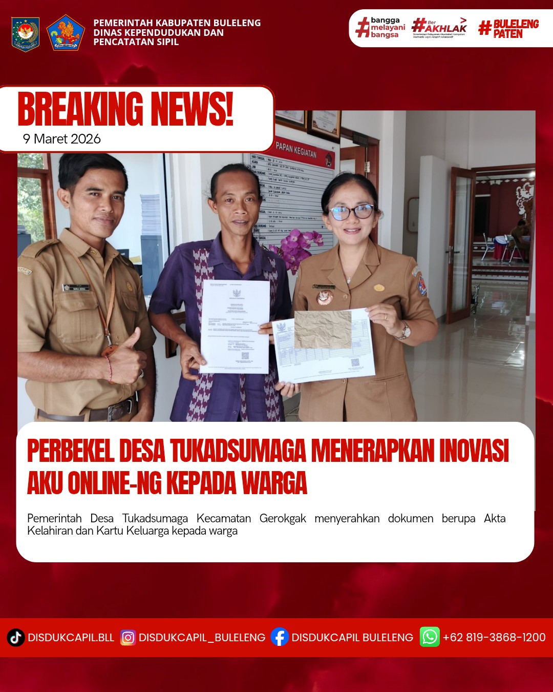 Pemerintah Kabupaten Buleleng melalui Dinas Kependudukan dan Pecatatan Sipil (Disdukcapil) Kabupaten Buleleng memaksimalkan serta mempermudah pelayanan kependudukan masyarakat dengan beberapa inovasi, melalui aplikasi AKU Online-NG. Dimana dalam penerapan aplikasi Aku Online-NG tersebut masyarakat tidak perlu lagi datang ke Dinas Dukcapil untuk melakukan pelayanan langsung cukup dengan datang ke Desa nanti akan dibantu oleh operator Desa masing-masing. Di Desa Tukadsumaga Kecamatan Gerokgak, telah diserahkan dokumen kependudukan berupa Akta Kelahiran atas nama Ni Ketut Darmiati dan Kartu Keluarga atas nama I Gede Darma Tirta Yasa yang diserahkan oleh Perbekel Desa Tukadsumaga Anak Agung Sri Wathi didampingi oleh Kelian Banjar Dinas Gandongan Ketut Wira Sena di Desa Tukadsumaga, Senin (9/3).