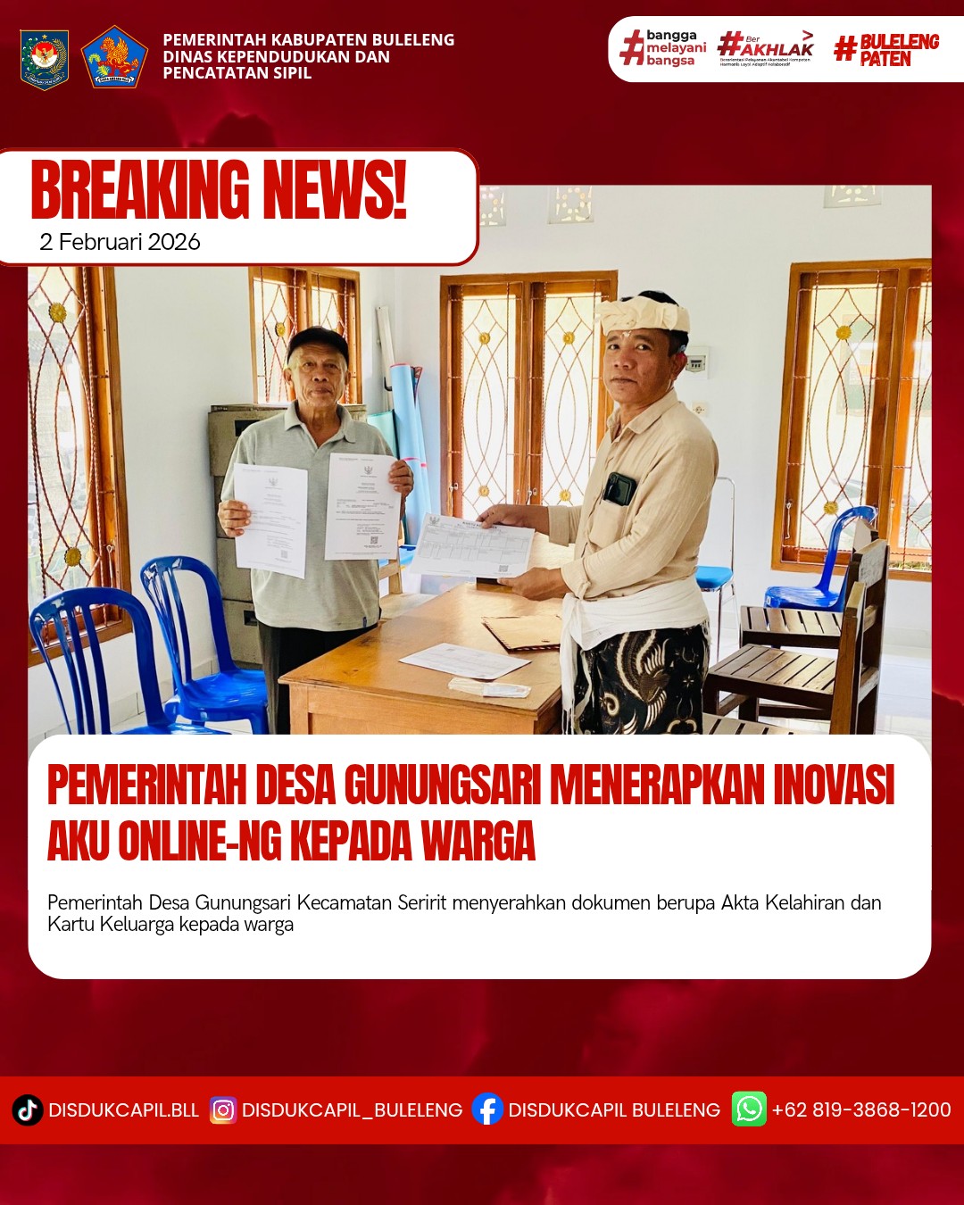 Pemerintah Kabupaten Buleleng melalui Dinas Kependudukan dan Pecatatan Sipil (Disdukcapil) Kabupaten Buleleng memaksimalkan serta mempermudah pelayanan kependudukan masyarakat dengan beberapa inovasi, melalui aplikasi AKU Online-NG. Dimana dalam penerapan aplikasi Aku Online-NG tersebut masyarakat tidak perlu lagi datang ke Dinas Dukcapil untuk melakukan pelayanan langsung cukup dengan datang ke Desa nanti akan dibantu oleh operator Desa masing-masing. Di Desa Gunungsari Kecamatan Seririt, telah diserahkan dokumen kependudukan berupa Akta Kelahiran atas nama Ketut Suwelen dan istrinya Nyoman Suatip dan Kartu Keluarga warga Banjar Dinas Puspajati, Desa Gunungsari yang diserahkan oleh Pemerintah Desa Gunungsari kepada warga Banjar Dinas Puspajati Desa Gunungsari, bertempat di Kantor Perbekel Desa Gunungsari, Kecamatan Seririt, Kabupaten Buleleng, Senin (2/2).