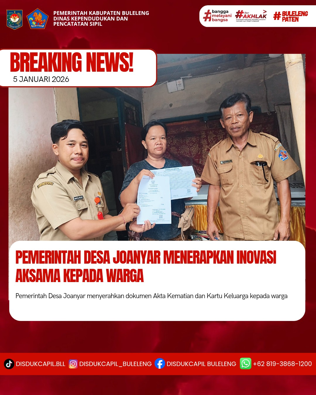 Pemerintah Kabupaten Buleleng melalui Dinas Kependudukan dan Pecatatan Sipil (Disdukcapil) Kabupaten Buleleng memaksimalkan serta mempermudah pelayanan kependudukan masyarakat dengan beberapa inovasi, yakni BALITA (Bayi Lahir Berakta), NYAKSI (Menyerahkan Akta Kawin Saat Acara Perkawinan) dan AKSAMA ( Akta Kematian Diserahkan Saat Masih Berduka) melalui aplikasi Aku Online-NG. Di Desa Joanyar Kecamatan Seririt, telah diterapkan program Aksama (Akta Kematian Diserahkan Saat Masih Berduka) yang dilakukan secara langsung oleh Kasi Pemerintahan bersama KBD. Kelodan dengan menyerahkan Akta Kematian dan Kartu Keluarga atas nama Luh Ratini kepada keluarga almarhum di Rumah Duka di Desa Joanyar, Senin (5/1).