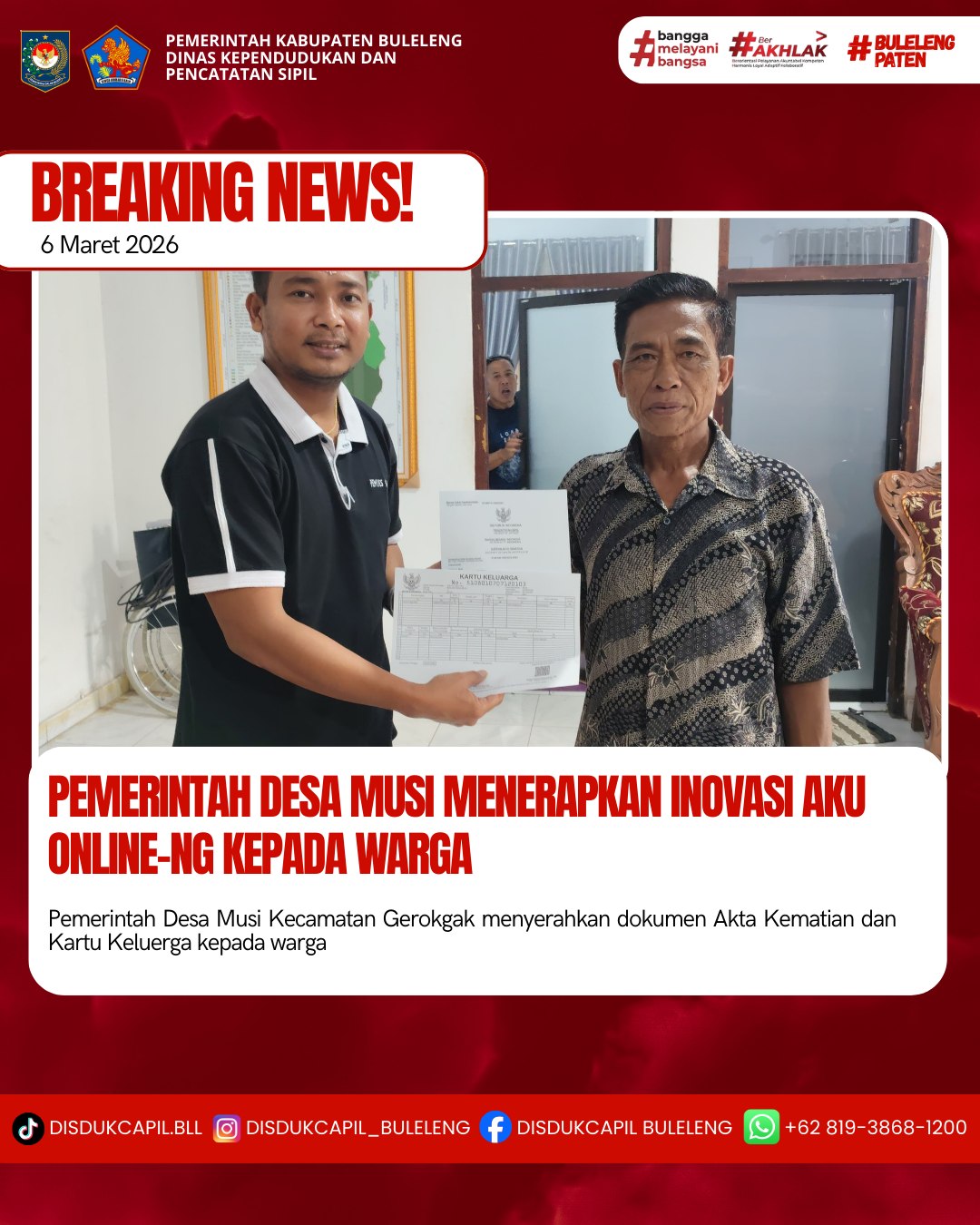 Pemerintah Kabupaten Buleleng melalui Dinas Kependudukan dan Pecatatan Sipil (Disdukcapil) Kabupaten Buleleng memaksimalkan serta mempermudah pelayanan kependudukan masyarakat dengan beberapa inovasi, melalui aplikasi AKU Online-NG. Dimana dalam penerapan aplikasi Aku Online-NG tersebut masyarakat tidak perlu lagi datang ke Dinas Dukcapil untuk melakukan pelayanan langsung cukup dengan datang ke Desa nanti akan dibantu oleh operator Desa masing-masing. Di Desa Musi Kecamatan Gerokgak, telah diserahkan dokumen kependudukan berupa Akta Kematian dan Kartu Keluarga yang diserahkan langsung oleh Kasi Pemerintahan Desa Musi Kecamatan Gerokgak, Kabupaten Buleleng, Jumat (6/3).