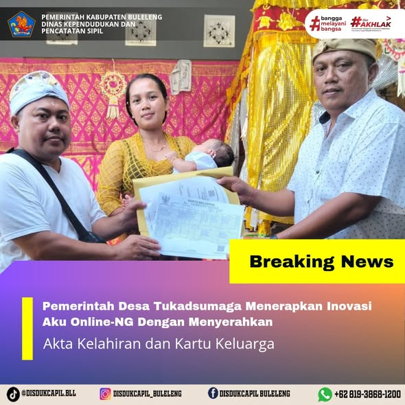 Pemerintah Kabupaten Buleleng melalui Dinas Kependudukan dan Pecatatan Sipil (Disdukcapil) Kabupaten Buleleng memaksimalkan serta mempermudah pelayanan kependudukan masyarakat dengan beberapa inovasi, melalui aplikasi AKU Online-NG. Dimana dalam penerapan aplikasi Aku Online-NG tersebut masyarakat tidak perlu lagi datang ke Dinas Dukcapil untuk melakukan pelayanan langsung cukup dengan datang ke Desa nanti akan dibantu oleh operator Desa masing-masing. Di Desa Tukadsumaga Kecamatan Gerokgak, telah diserahkan dokumen kependudukan berupa Akta Kelahiran dan Kartu Keluarga atas nama I Ketut Wira Sena yang diserahkan oleh Kelian Banjar Dinas Buluh Ketut Artaya, Sabtu (6/12).