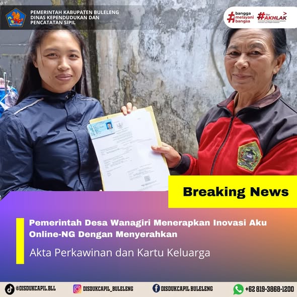Pemerintah Kabupaten Buleleng melalui Dinas Kependudukan dan Pecatatan Sipil (Disdukcapil) Kabupaten Buleleng memaksimalkan serta mempermudah pelayanan kependudukan masyarakat dengan beberapa inovasi, melalui aplikasi AKU Online-NG. Dimana dalam penerapan aplikasi Aku Online-NG tersebut masyarakat tidak perlu lagi datang ke Dinas Dukcapil untuk melakukan pelayanan langsung cukup dengan datang ke Desa nanti akan dibantu oleh operator Desa masing-masing. Di Desa Wanagiri Kecamatan Sukasada, telah diserahkan dokumen kependudukan berupa Dokumen Akta Perkawinan dan Kartu Keluarga atas nama I Gede Dedi Arta suksma oleh Pemerintah Desa Wanagiri bertempat di kantor Desa Wanagiri, Senin (15/12).