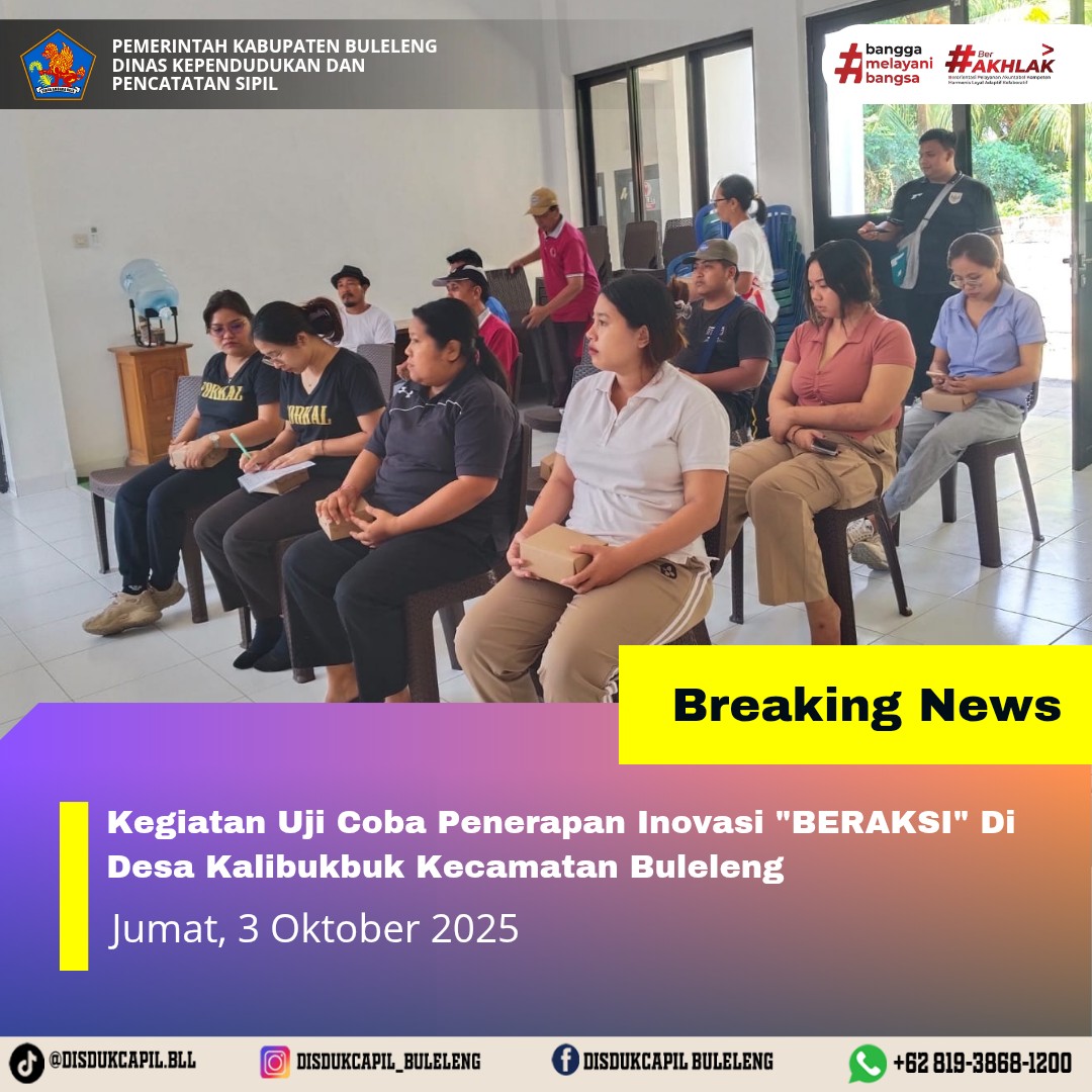 Kepala Bidang Pelayanan dan Pencatatan Sipil Disdukcapil Kabupaten Buleleng melaksanakan kegiatan uji coba penerapan Inovasi "BERAKSI" Di Desa Kalibukbuk Kecamatan Buleleng. Inovasi "BERAKSI" (Bertemu Warga Untuk Konsultasi dan Memberi Solusi) merupakan Inovasi baru di Disdukcapil Buleleng sebagai upaya membantu masyarakat dalam memberikan solusi dalam mengatasi permasalahan administrasi kependudukan dengan datang ke Desa dan langsung bertemu dengan masyarakat, Jumat (3/10).