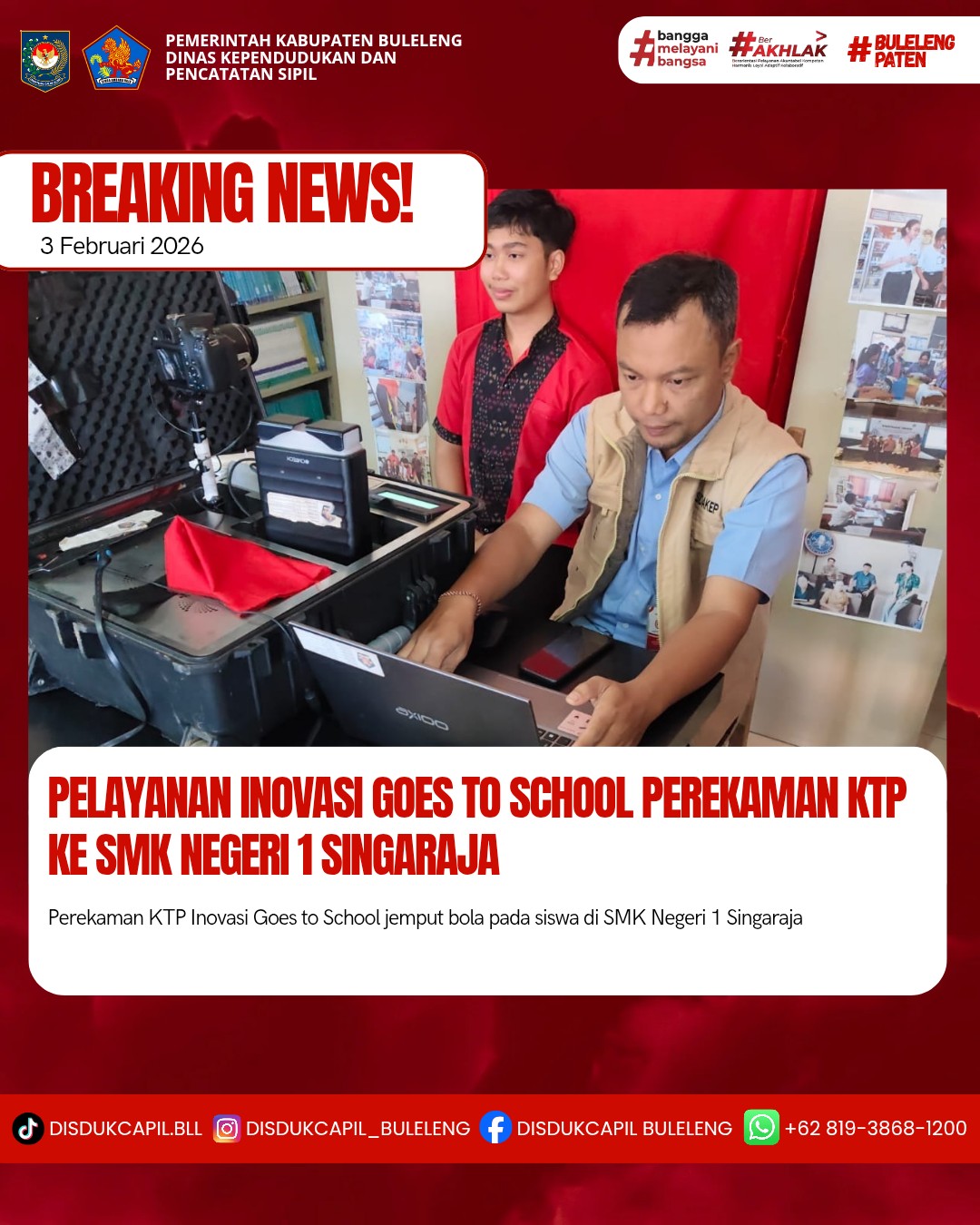Pada kali ini Selasa, 3 Februari 2026 pelayanan perekaman KTP-el dilaksanakan di SMK Negeri 1 Singaraja. Hasil perekaman di SMK Negeri 1 Singaraja dengan data BNBA sebanyak 106 orang dan total yang melakukan perekaman sebanyak 36 orang, dimana hasil perekaman data di dalam BNBA sebanyak 36 orang dan tidak ada data di luar BNBA yang melakukan perekaman. Dilihat dari hasil tersebut sisa data BNBA yang belum perekaman sebanyak 70 orang informasi dari sekolah yang tidak hadir perekaman karena tidak sekolah, sudah perekaman dan tidak berkenan perekaman (ingin perekaman mandiri ke kantor camat/kantor disdukcapil).