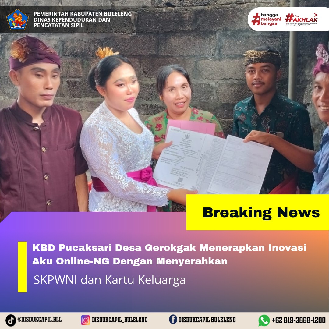 Pemerintah Kabupaten Buleleng melalui Dinas Kependudukan dan Pecatatan Sipil (Disdukcapil) Kabupaten Buleleng memaksimalkan serta mempermudah pelayanan kependudukan masyarakat dengan beberapa inovasi, melalui aplikasi AKU Online. Dimana dalam penerapan aplikasi Aku Online tersebut masyarakat tidak perlu lagi datang ke Dinas Dukcapil untuk melakukan pelayanan langsung cukup dengan datang ke Desa nanti akan dibantu oleh operator Desa masing-masing. Di Desa Gerokgak Kecamatan Gerokgak telah diserahkan dokumen kependudukan berupa SKPWNI dan Kartu Keluarga atas nama Putu Rosa Oktaviani yang diserahkan oleh Kelian Banjar Dinas Pucaksari Desa Gerokgak Kecamatan Gerokgak bersama dengan Ibu Perbekel Desa Tampekan, Kamis (2/10).