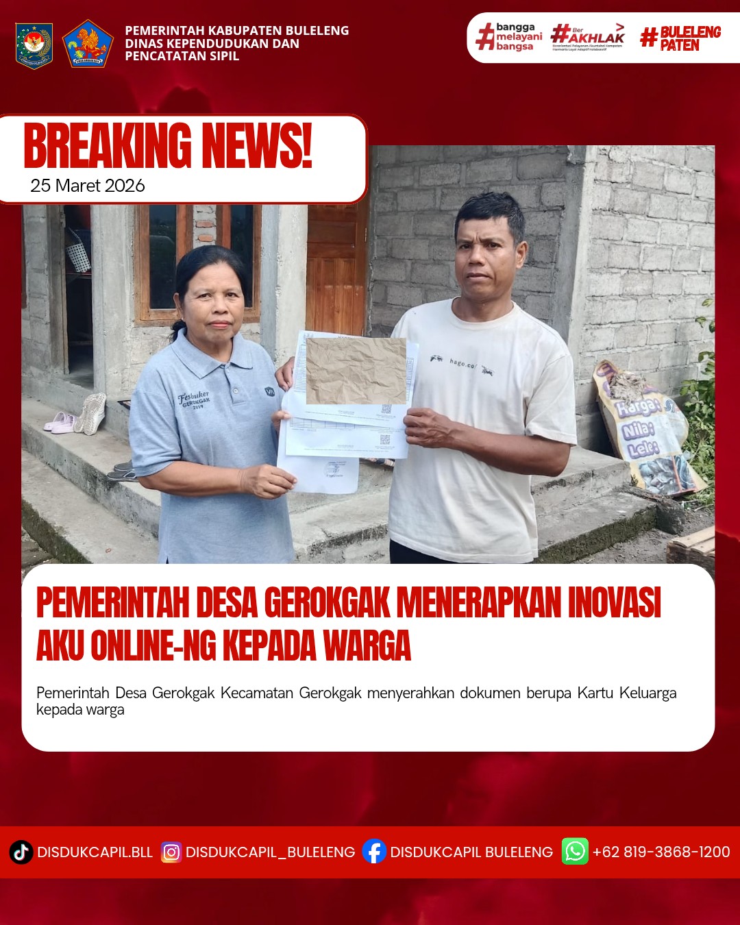 Pemerintah Kabupaten Buleleng melalui Dinas Kependudukan dan Pecatatan Sipil (Disdukcapil) Kabupaten Buleleng memaksimalkan serta mempermudah pelayanan kependudukan masyarakat dengan beberapa inovasi, melalui aplikasi AKU Online-NG. Dimana dalam penerapan aplikasi Aku Online-NG tersebut masyarakat tidak perlu lagi datang ke Dinas Dukcapil untuk melakukan pelayanan langsung cukup dengan datang ke Desa nanti akan dibantu oleh operator Desa masing-masing. Di Desa Gerokgak Kecamatan Gerokgak, telah diserahkan dokumen kependudukan berupa Kartu Keluarga atas nama Ketut Yoyong dan Putu Mas Rinda Melani yang diserahkan langsung oleh Kasi Pemerintahan Desa Gerokgak di Desa Gerokgak, Kecamatan Gerokgak, Kabupaten Buleleng, Rabu (25/3).
