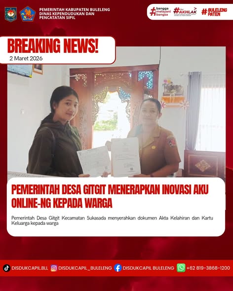 Pemerintah Kabupaten Buleleng melalui Dinas Kependudukan dan Pecatatan Sipil (Disdukcapil) Kabupaten Buleleng memaksimalkan serta mempermudah pelayanan kependudukan masyarakat dengan beberapa inovasi, melalui aplikasi AKU Online-NG. Dimana dalam penerapan aplikasi Aku Online-NG tersebut masyarakat tidak perlu lagi datang ke Dinas Dukcapil untuk melakukan pelayanan langsung cukup dengan datang ke Desa nanti akan dibantu oleh operator Desa masing-masing. Di Desa Gitgit Kecamatan Sukasada, telah diserahkan dokumen kependudukan berupa Akta Kelahiran dan Kartu Keluarga atas nama Ketut Dana yang diserahkan secara langsung oleh Kasi Pemerintahan Desa Gitgit Kecamatan Sukasada kepada warga di Desa Gitgit Kecamatan Sukasada, Kabupaten Buleleng, Senin (2/3).