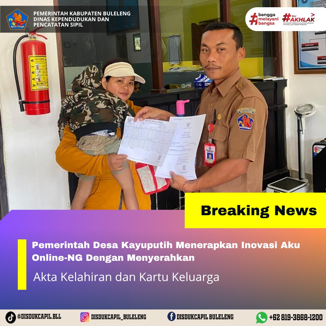 Pemerintah Kabupaten Buleleng melalui Dinas Kependudukan dan Pecatatan Sipil (Disdukcapil) Kabupaten Buleleng memaksimalkan serta mempermudah pelayanan kependudukan masyarakat dengan beberapa inovasi, melalui aplikasi AKU Online-NG. Dimana dalam penerapan aplikasi Aku Online-NG tersebut masyarakat tidak perlu lagi datang ke Dinas Dukcapil untuk melakukan pelayanan langsung cukup dengan datang ke Desa nanti akan dibantu oleh operator Desa masing-masing. Di Desa Kayuputih Kecamatan Banjar, telah diserahkan dokumen kependudukan berupa Akta Kelahiran atas nama Made Wari dan Kartu Keluarga yang diserahkan secara langsung oleh Pemerintah Desa Kayuputih Kecamatan Banjar, Senin (10/11).